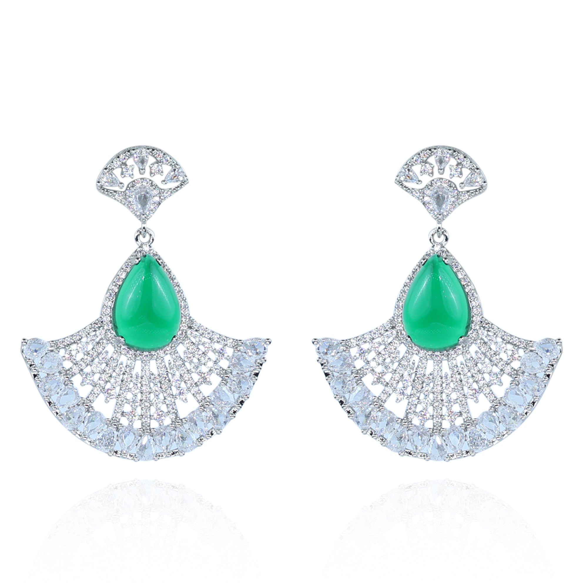 Aanura Silver Green Teardrop Fan Statement Earrings