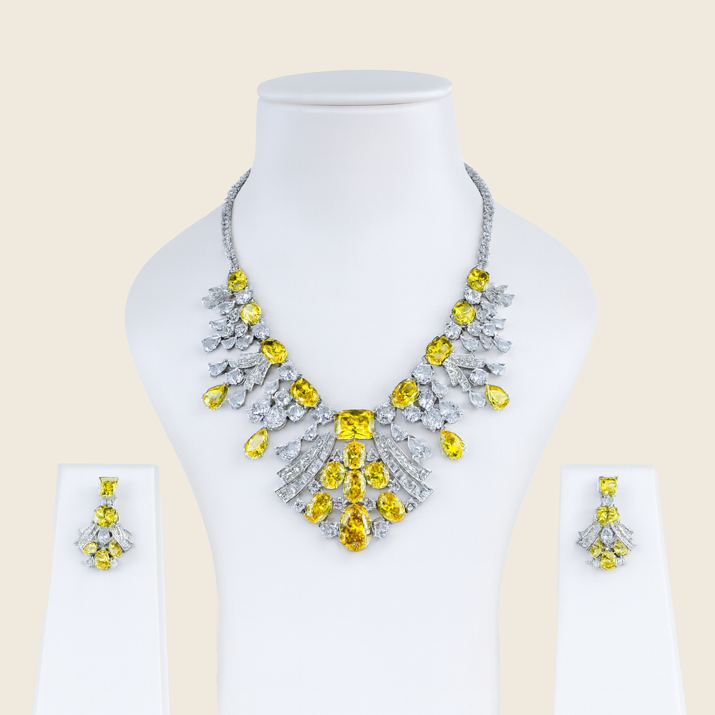 Product Description:Make a royal statement with this Majestic Yellow & White Drop Necklace Set. Featuring vibrant yellow teardrop stones paired with sparkling white CZ diamonds, this...(30%)Regular price Rs. 19,915.00Sale price Rs. 19,915.00 Regular priceUnit price perRs. 28,450.00 -