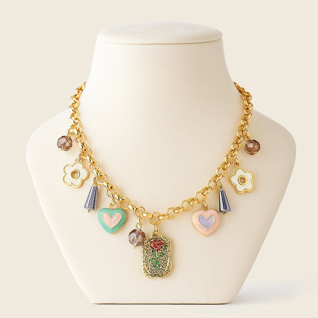 Product Description: The Colorful Charm Gold Necklace is a vibrant accessory featuring a chunky gold chain adorned with playful stainless steel charms — including pastel enamel...Regular price Rs. 1,450.00Sale price Rs. 1,450.00 Regular priceUnit price perRs. 2,900.00 -