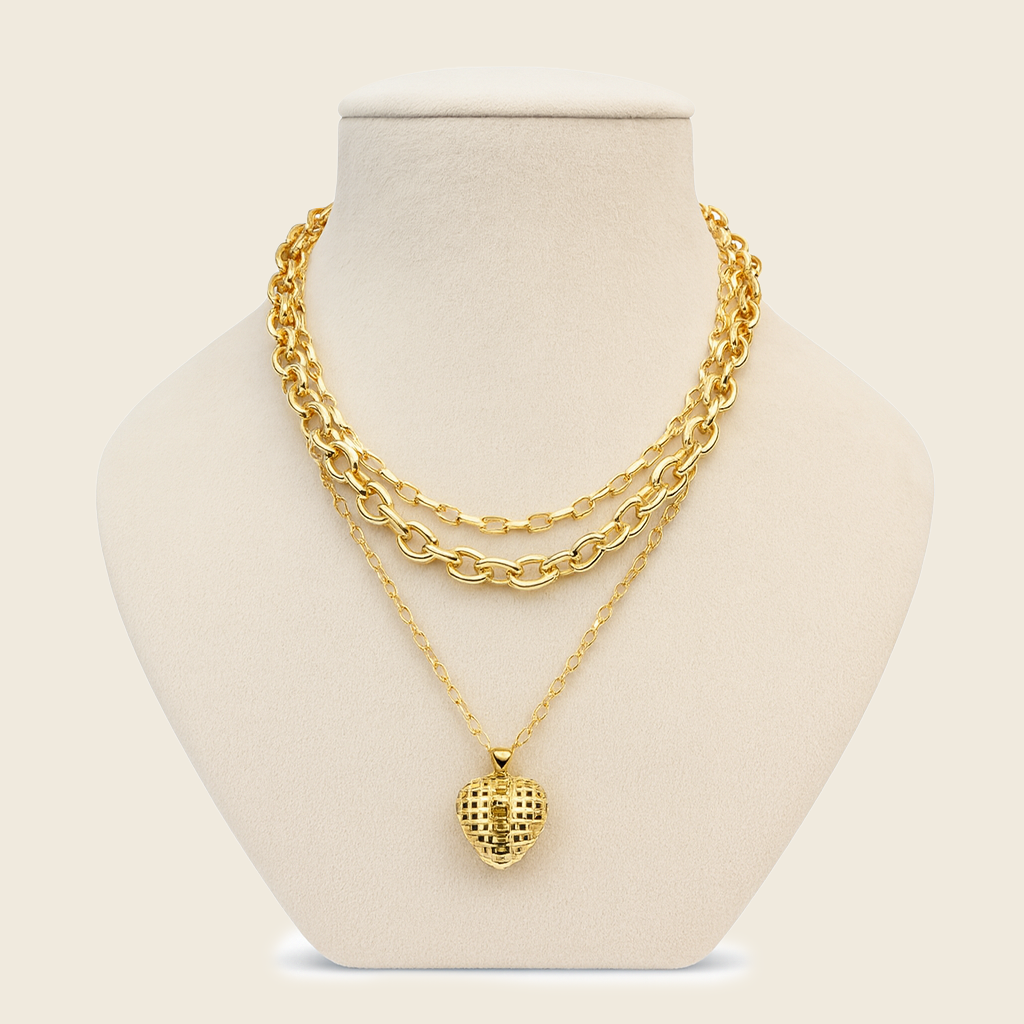 Aanura Layered Gold Chain Necklace with Waffle Heart Pendant