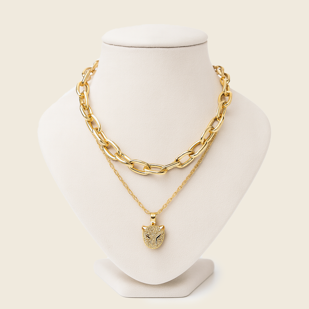 Product Description: The Gold Panther Pendant Layered Chain makes a bold statement with its chunky layered design and fierce panther charm encrusted with shimmering crystals. Crafted...Regular price Rs. 1,450.00Sale price Rs. 1,450.00 Regular priceUnit price perRs. 2,900.00 -