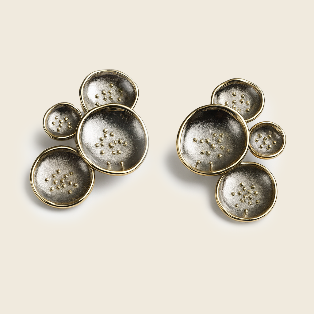 These earrings combine modern artistry with elegance. The abstract domes reflect light beautifully, while the golden details add depth and sophistication. Perfect for those who love statement jewelry with a touch of contemporary flair.