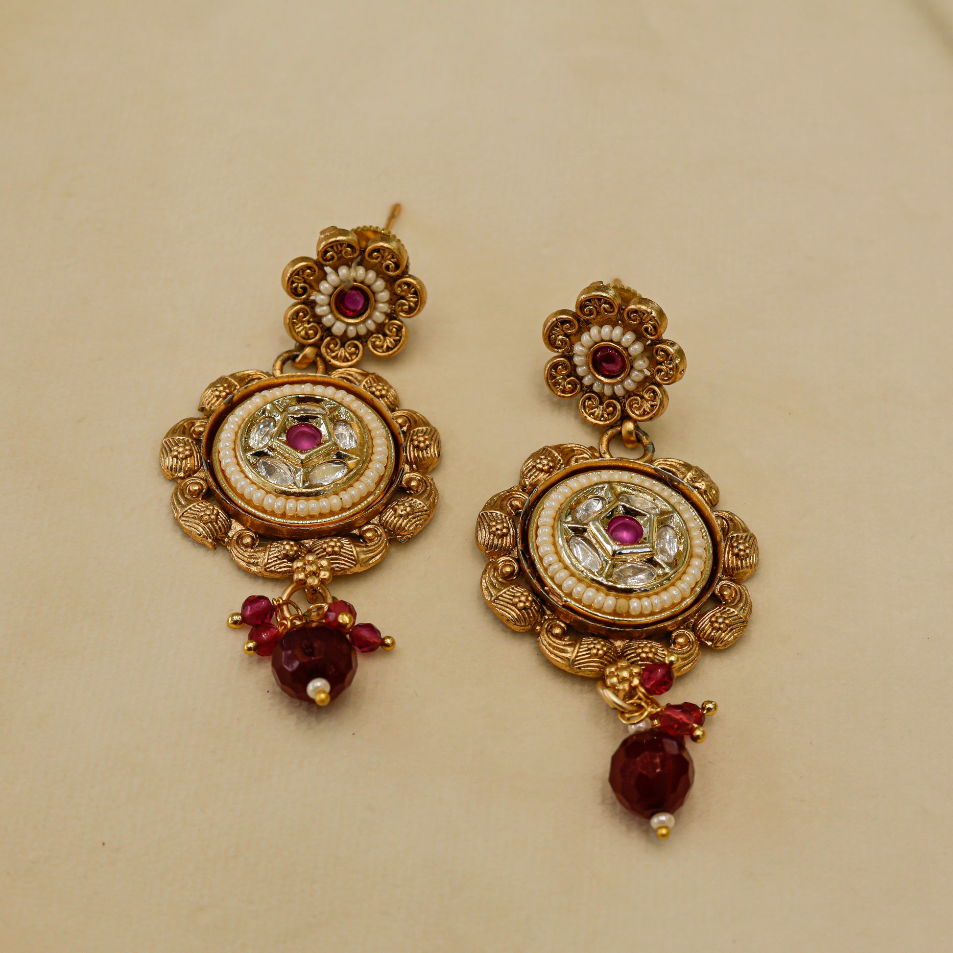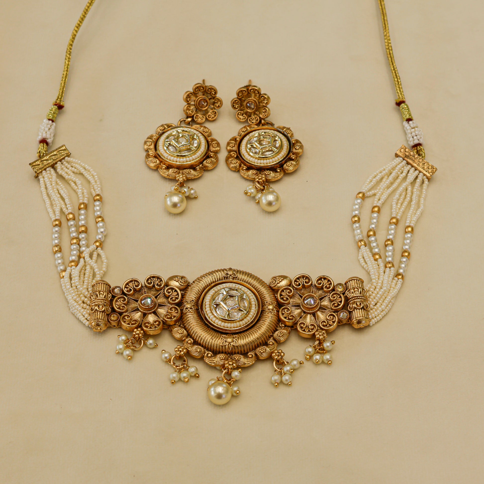 The Aanura Antique Circular Kundan Choker Necklace Set radiates traditional elegance with a bold central circular motif. Embellished with kundan stones, antique gold finish, and green bead danglers, this choker exudes royal grandeur. Matching earrings mirror the intricate detailing for a complete ethnic look.