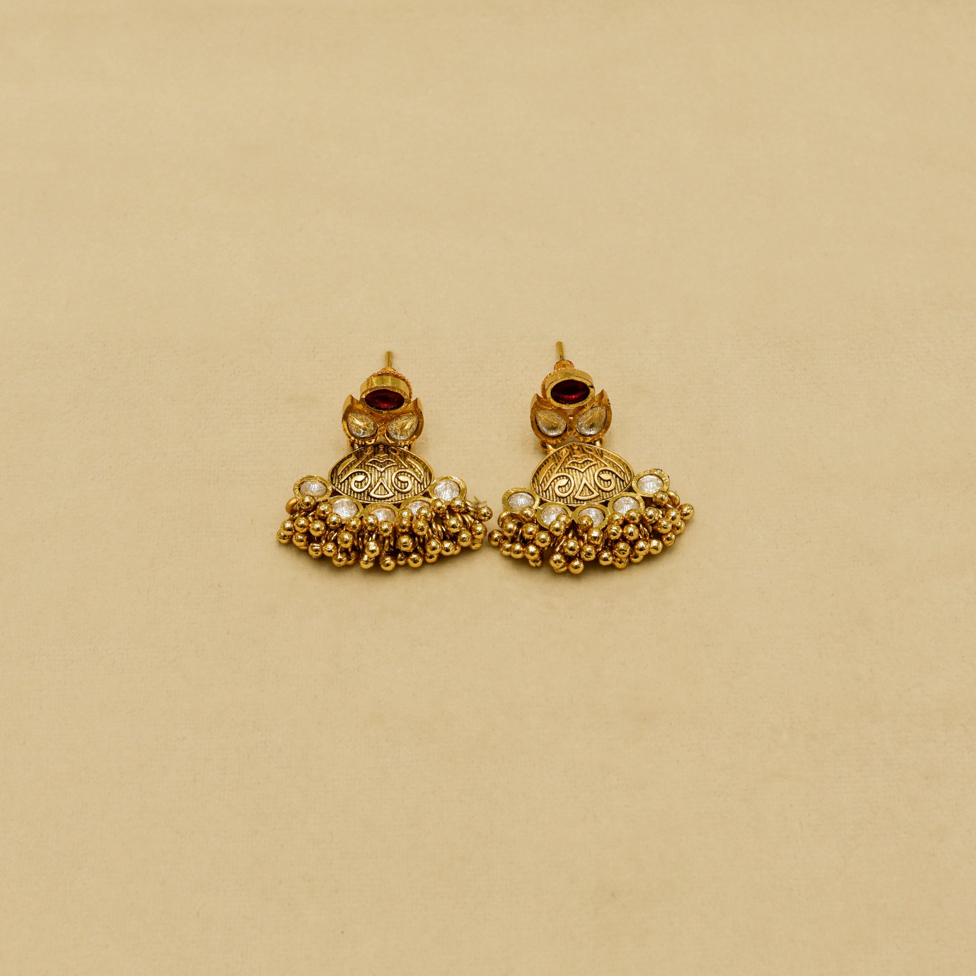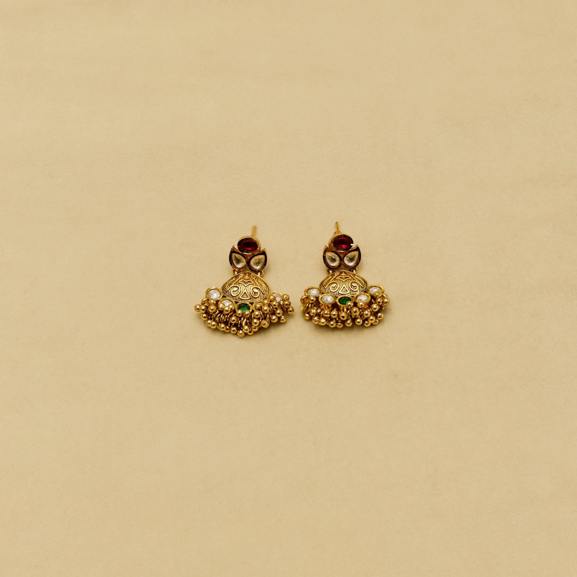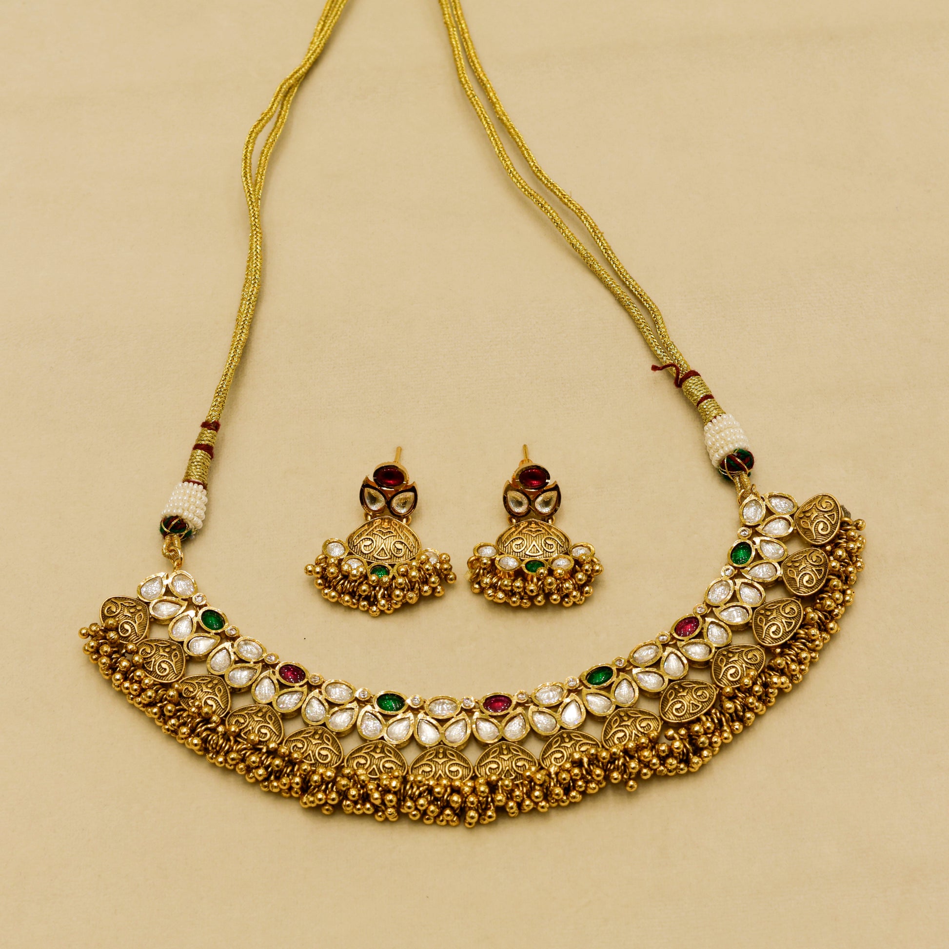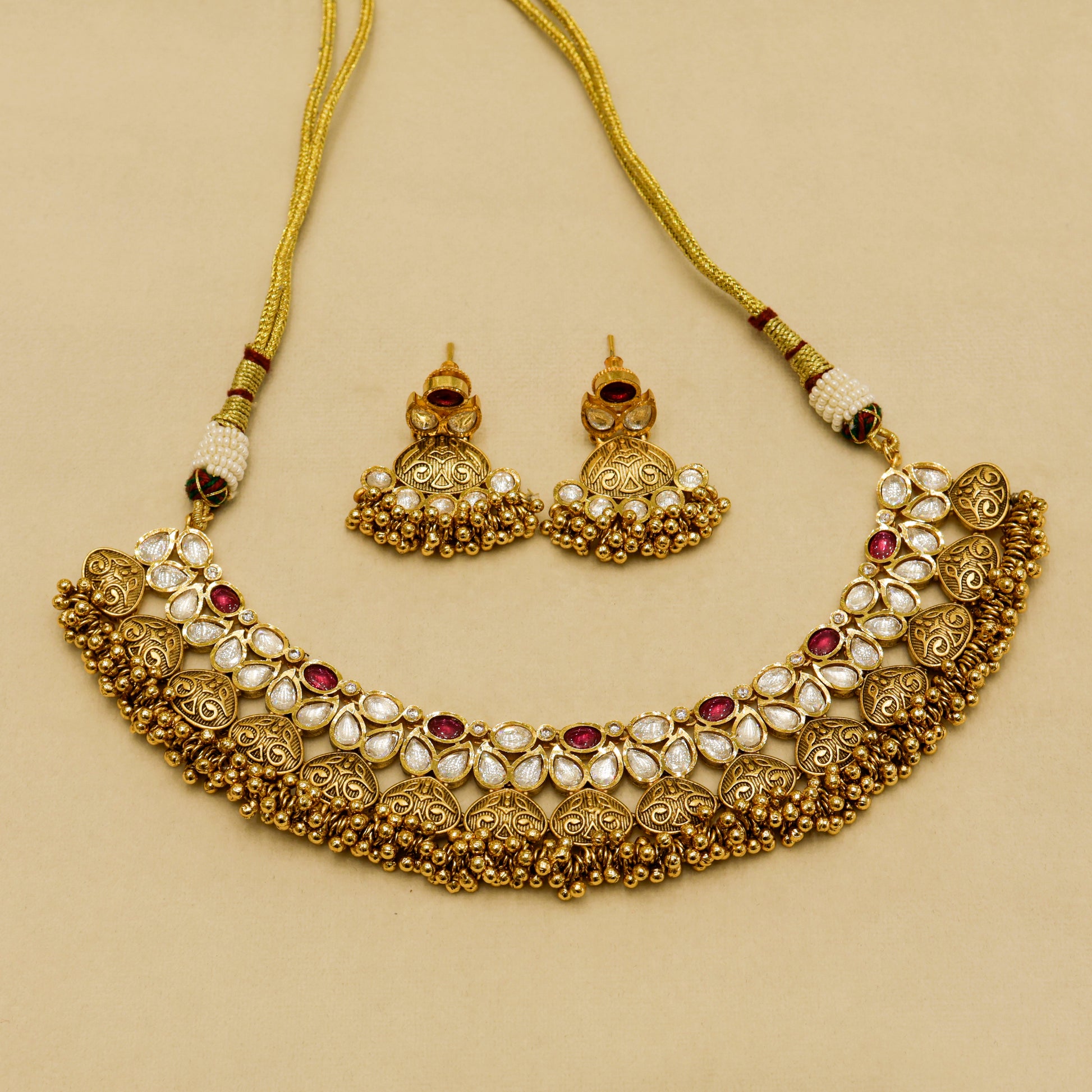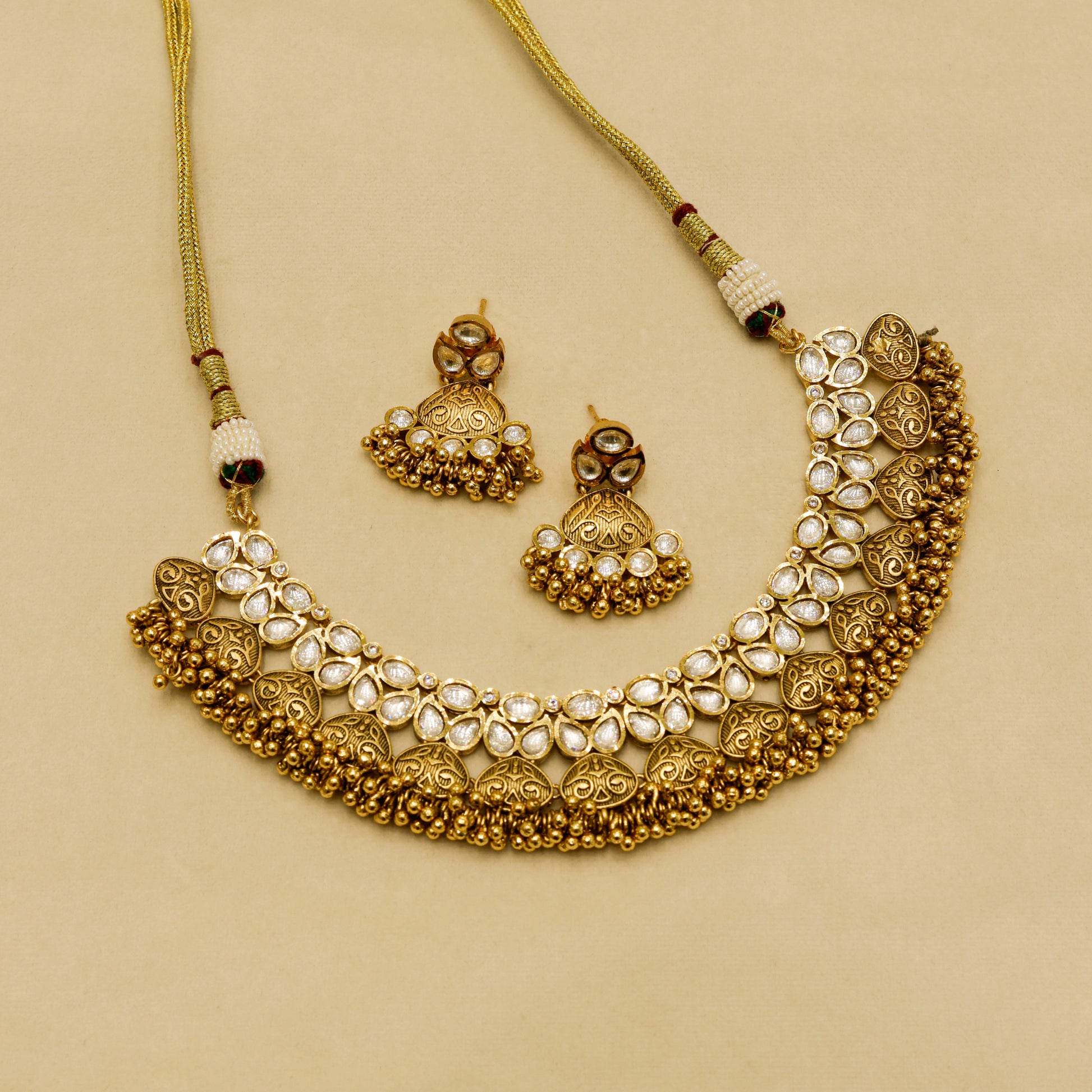 The Aanura Antique Gold Kundan Choker Necklace Set is a masterpiece of regal elegance and timeless design. Featuring a broad antique gold base adorned with sparkling kundan stones, this choker is finished with intricate carvings and delicate bead edging. The matching earrings carry the same motifs, completing the traditional aesthetic beautifully.