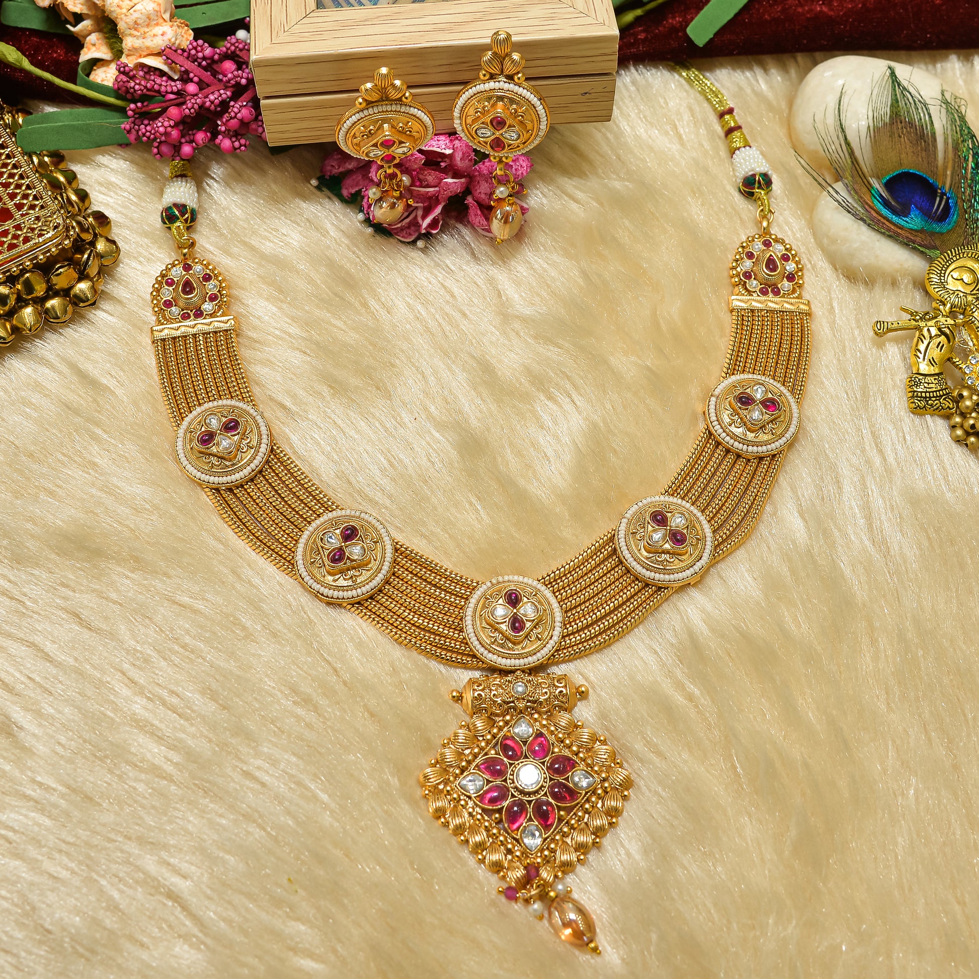 The Aanura Antique Long Necklace is a royal heritage piece crafted with multiple strands and circular ruby-studded motifs leading to a grand pendant. The pendant is adorned with kundan, ruby stones, and pearl drops, creating a majestic look. Matching earrings with antique detailing complete this bridal ensemble.