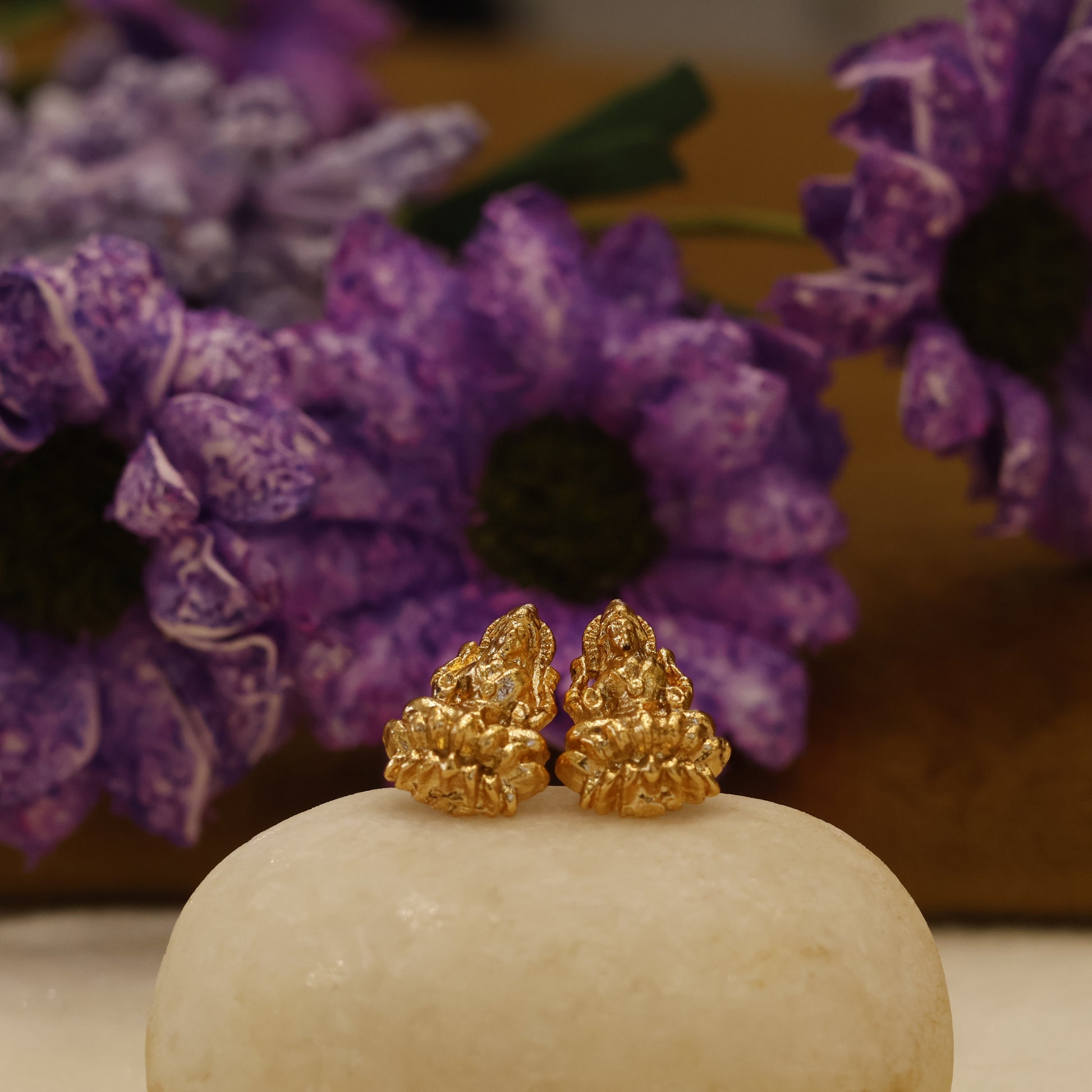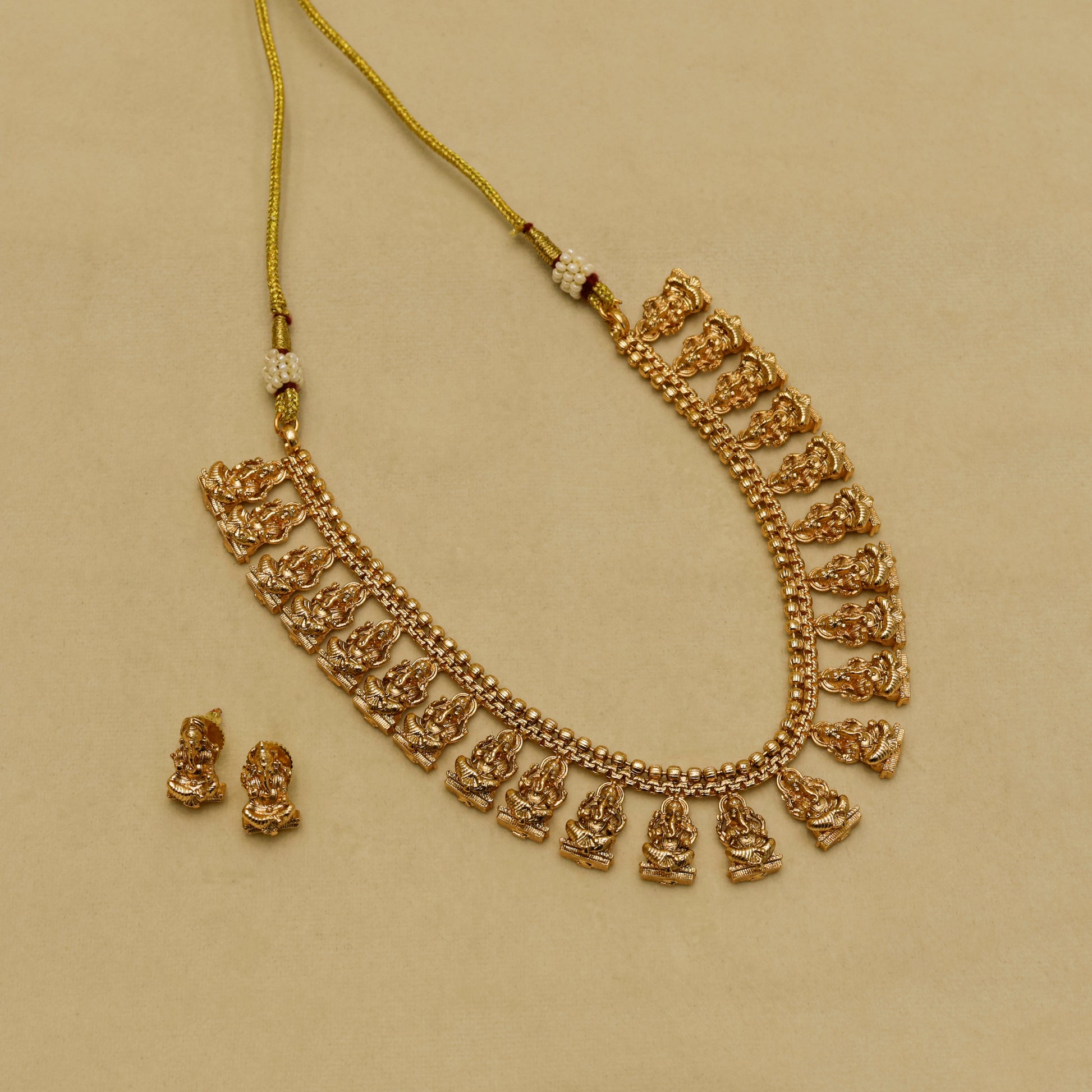 The Aanura Antique Temple Goddess Choker Necklace Set is a divine blend of heritage and artistry. Featuring a row of detailed Goddess Lakshmi motifs along the choker, this set symbolizes prosperity and grace. The antique gold plating enhances the traditional temple jewellery look, while the matching earrings complete its sacred charm.