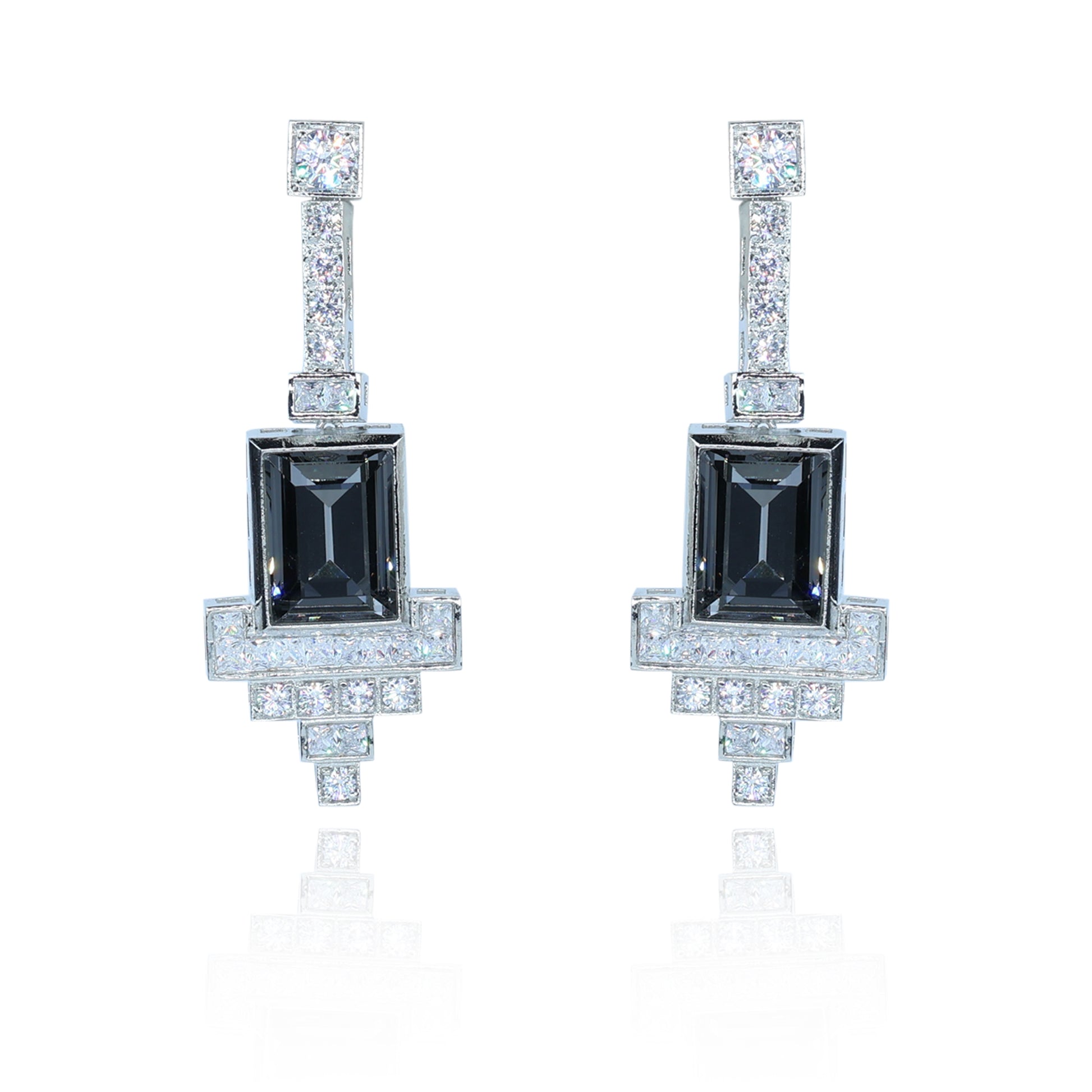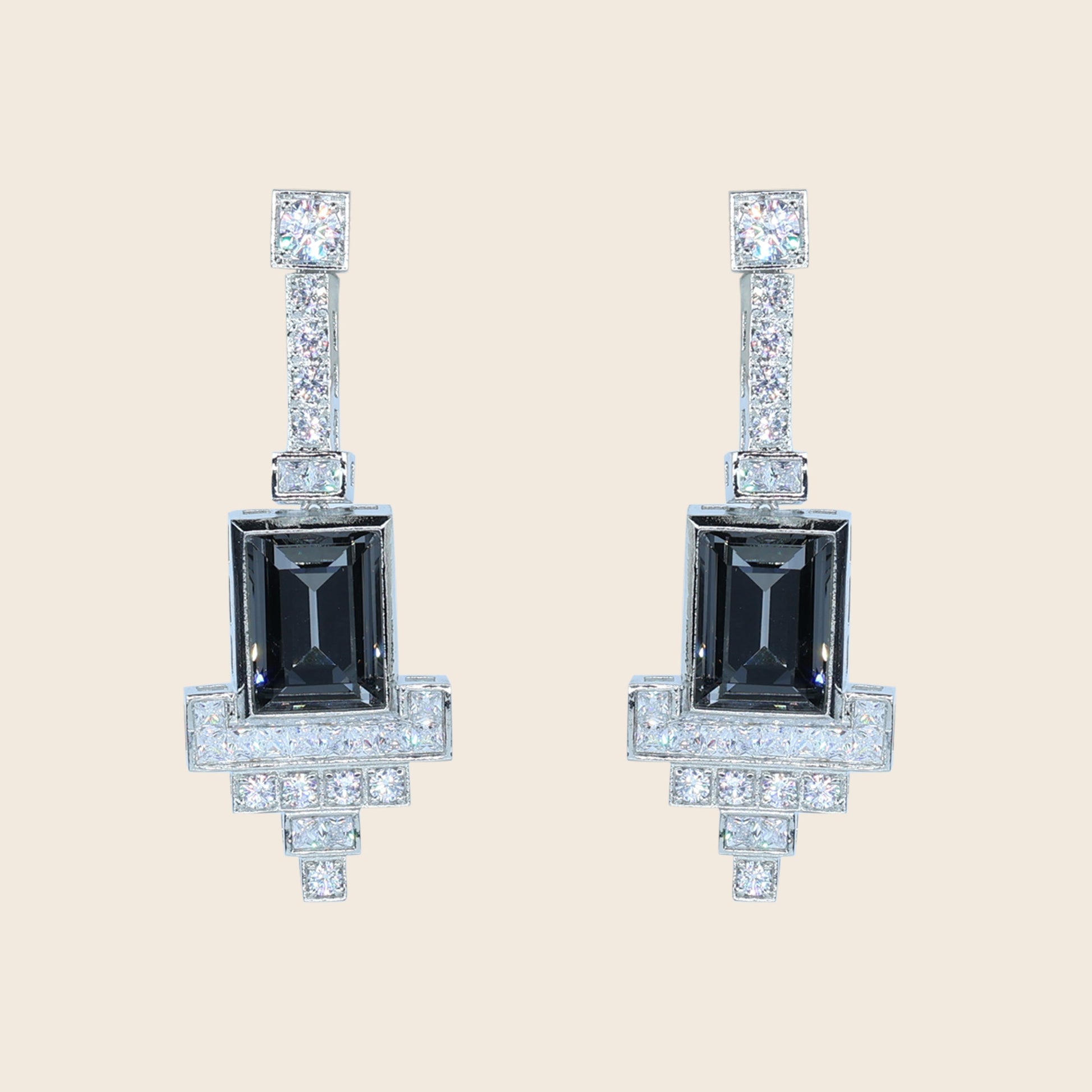 The clean lines and geometric symmetry reflect the Art Deco era, while the black emerald-cut crystal adds depth, drama, and elegance to your look.