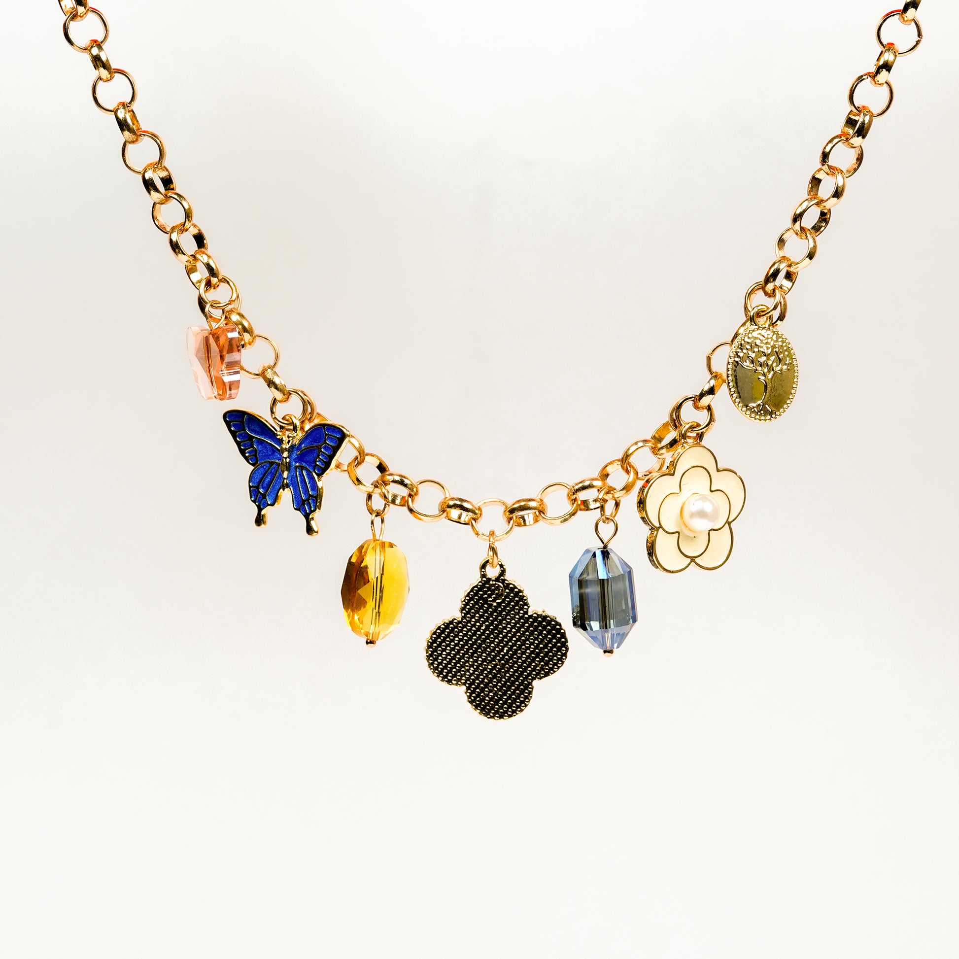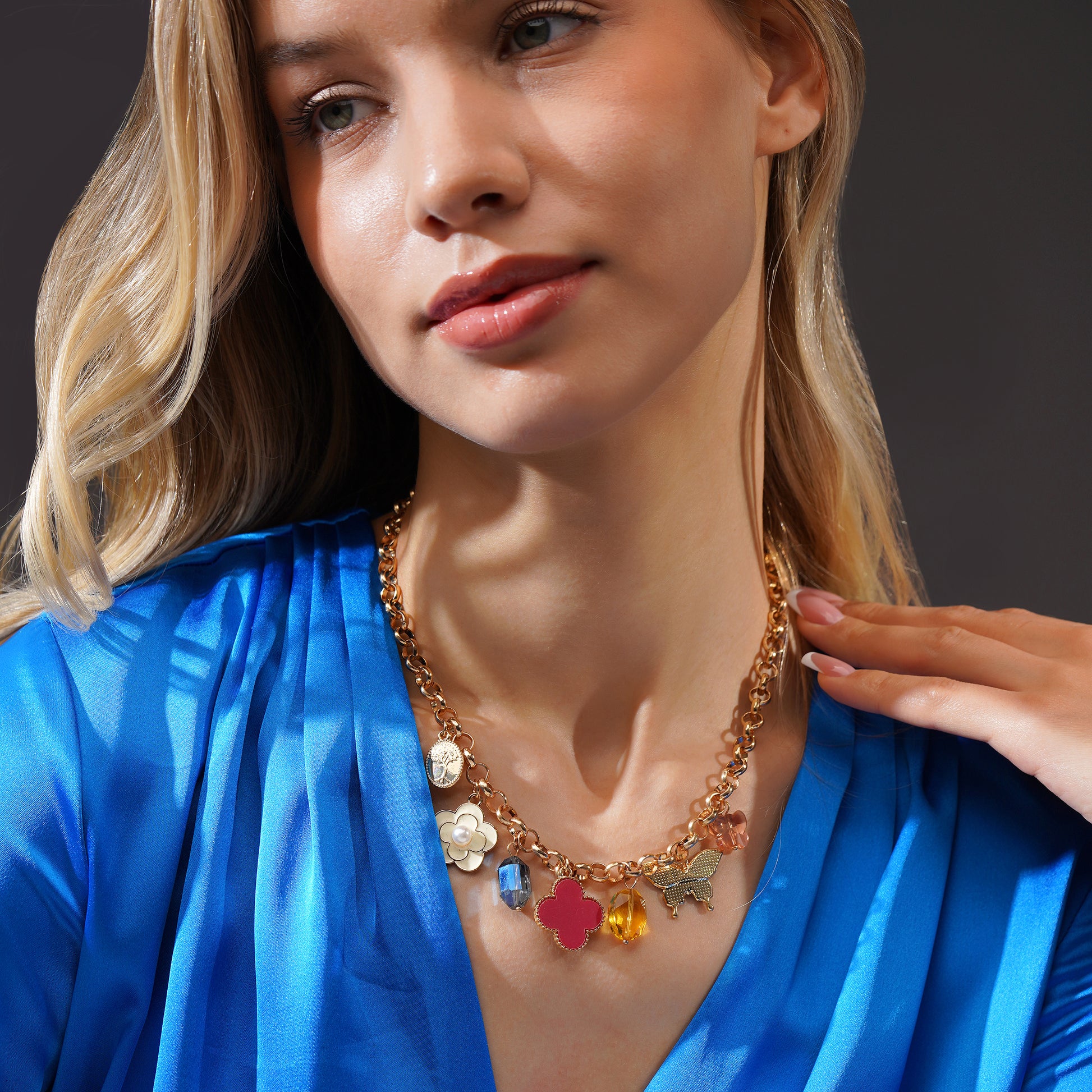 The mix of symbolic motifs and fluid chain links gives the necklace a modern, expressive character—perfect for women who enjoy jewellery with personality and storytelling detail. Designed to sit gracefully around the neckline, it adds instant depth and interest to any outfit.