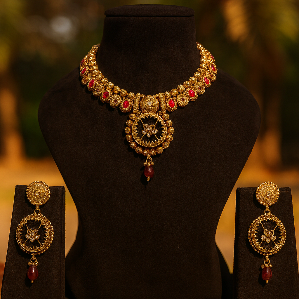 The Aanura Circular Heritage Necklace is a timeless masterpiece featuring round motifs with green kundan stones and a central floral pendant. Adorned with red accents and delicate danglers, this design is paired with matching long circular earrings, creating a regal and complete bridal look.