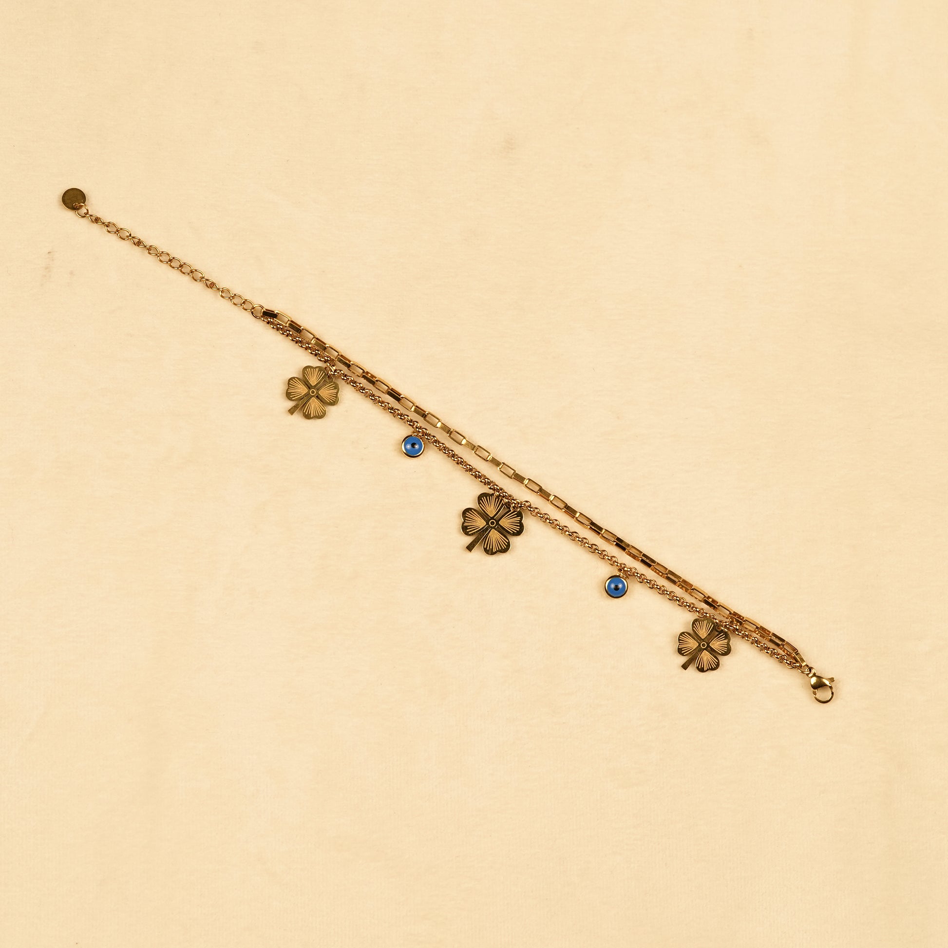 - Design Detail: Layered chain bracelet with clover-shaped charms and hanging accents