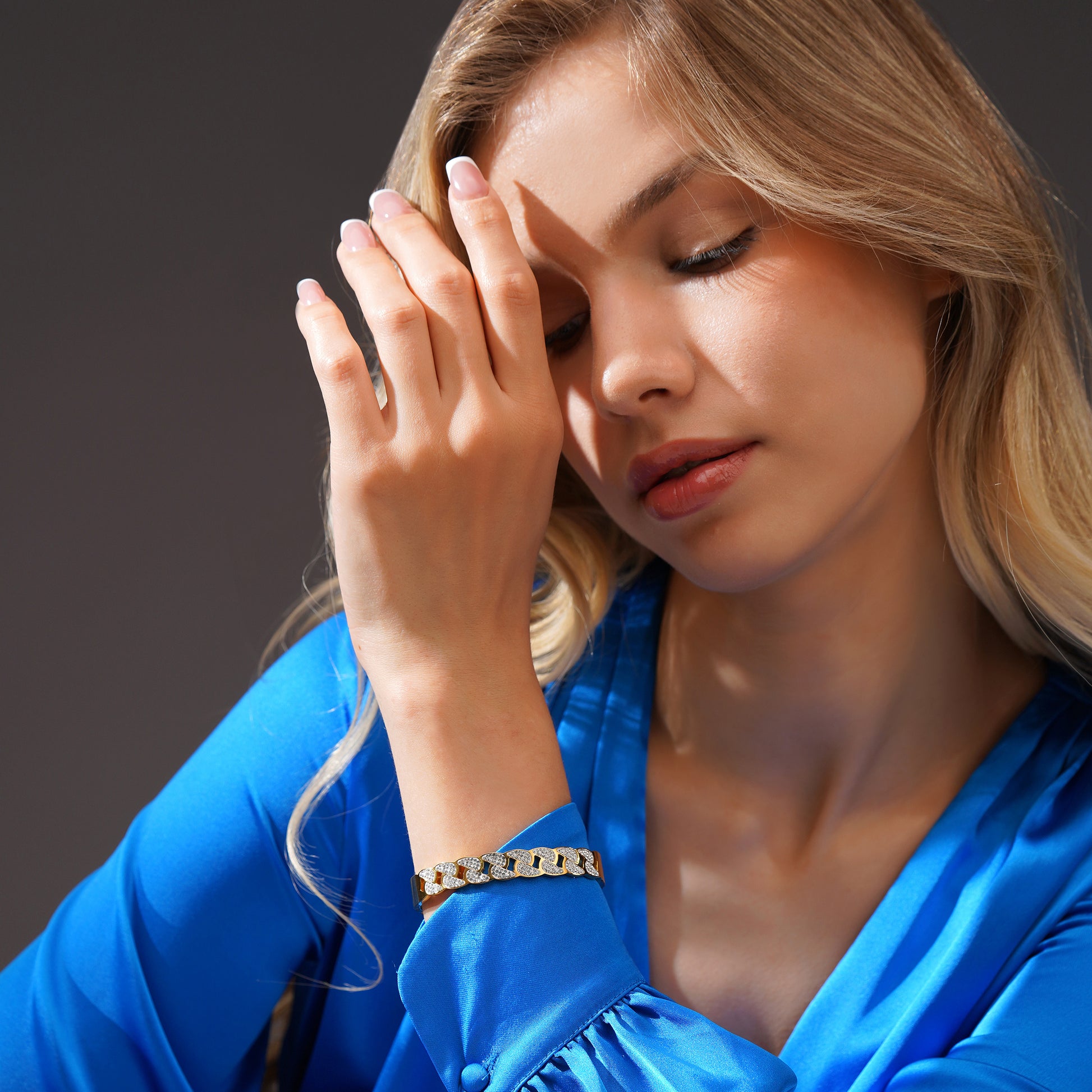 This elegant Aanura bangle bracelet features a refined chain-link inspired design accented with shimmering crystal detailing across the front. The structured silhouette and symmetrical pattern give it a timeless appeal, while the high-polish gold finish adds a touch of luxury. Designed for women who prefer graceful statement jewellery, this bracelet balances everyday elegance with festive charm.