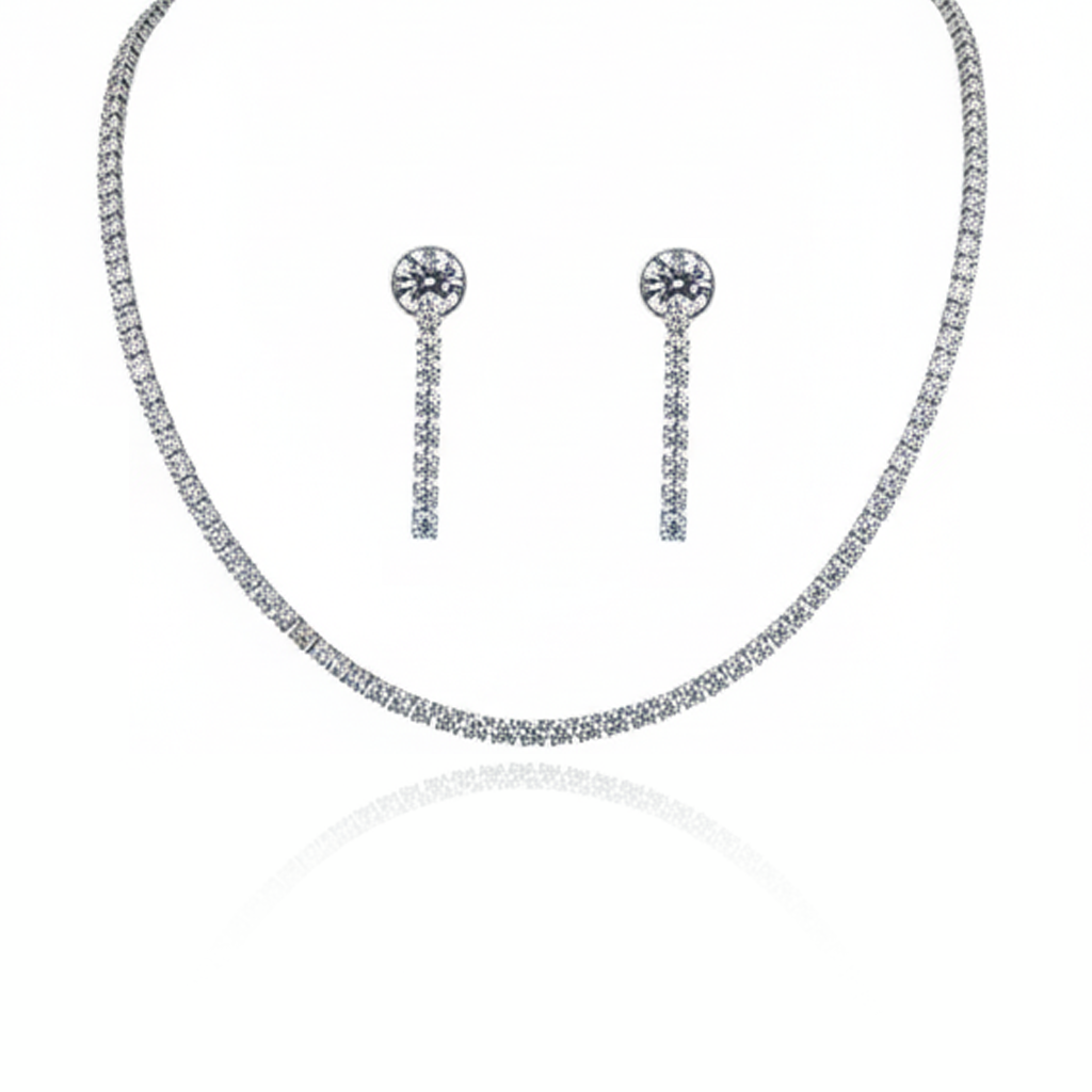 The necklace features a continuous row of shimmering stones, creating a classic tennis design. The earrings complement the look with a sleek drop pattern, adding elegance to every outfit.