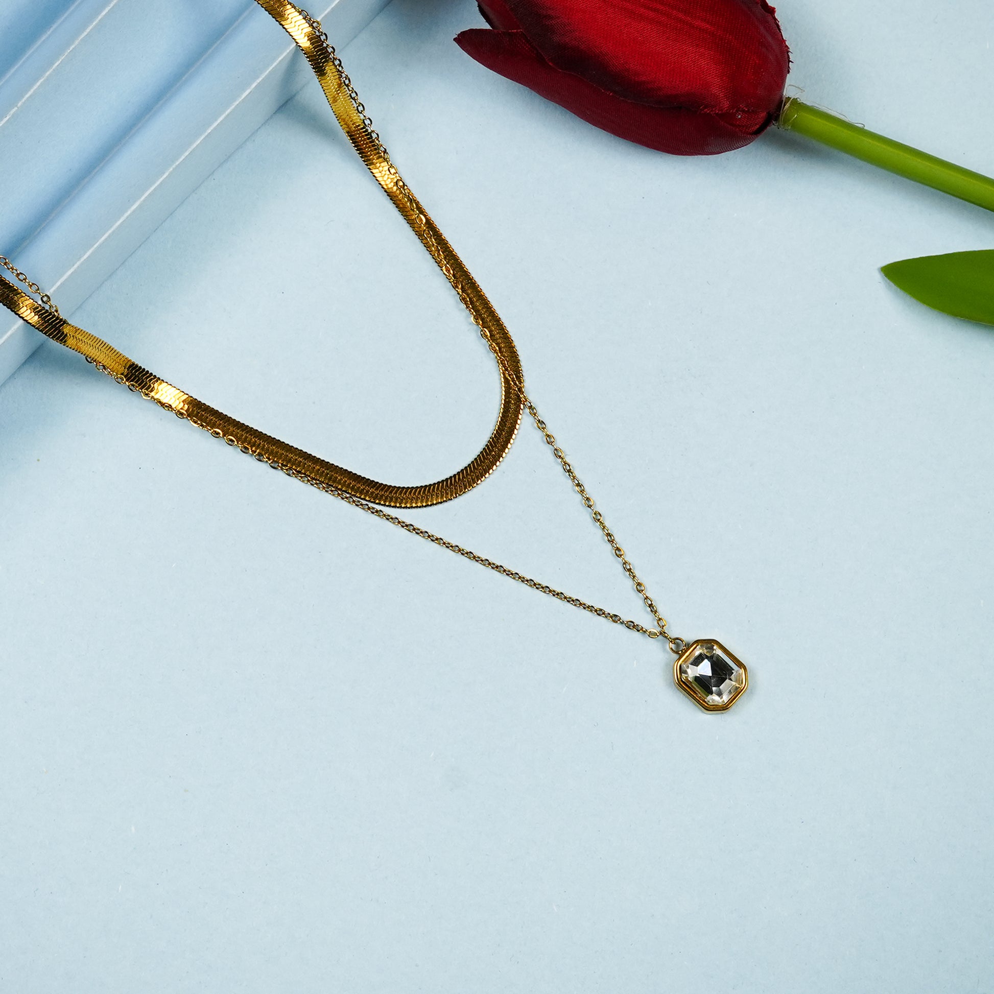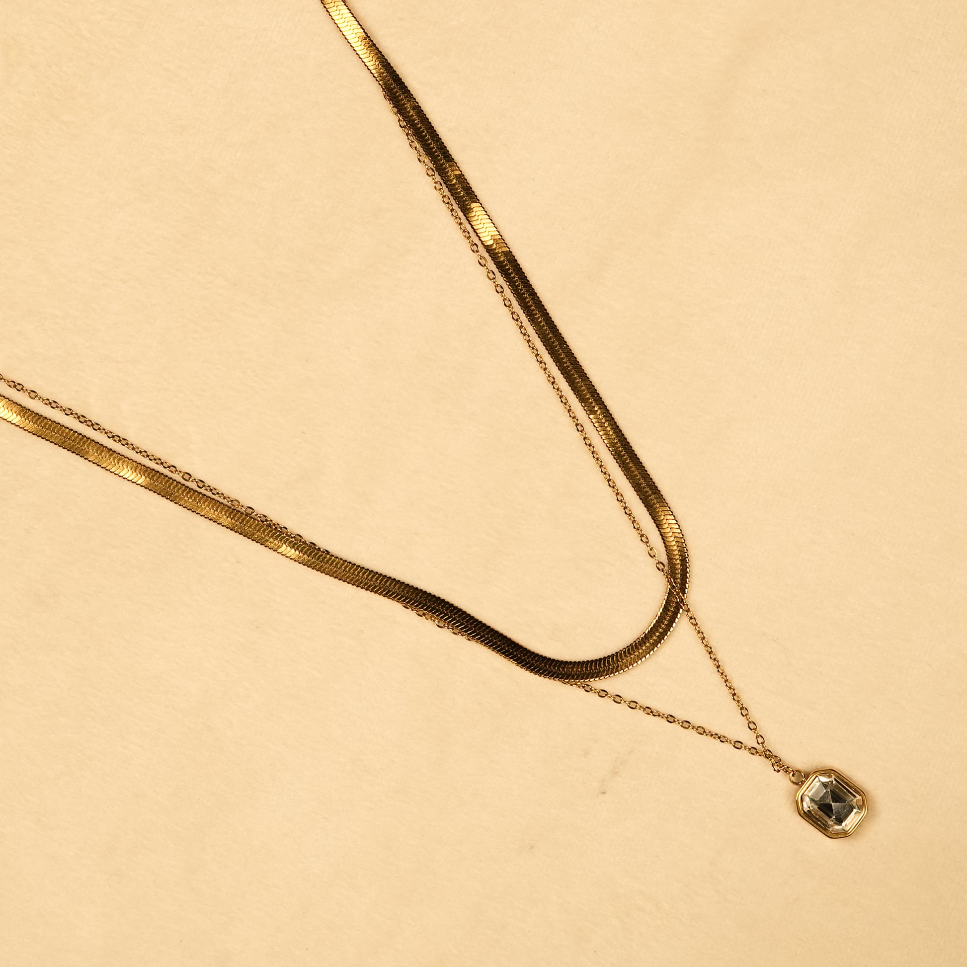 • Design Detail: Dual-layer chain with geometric bezel-set pendant