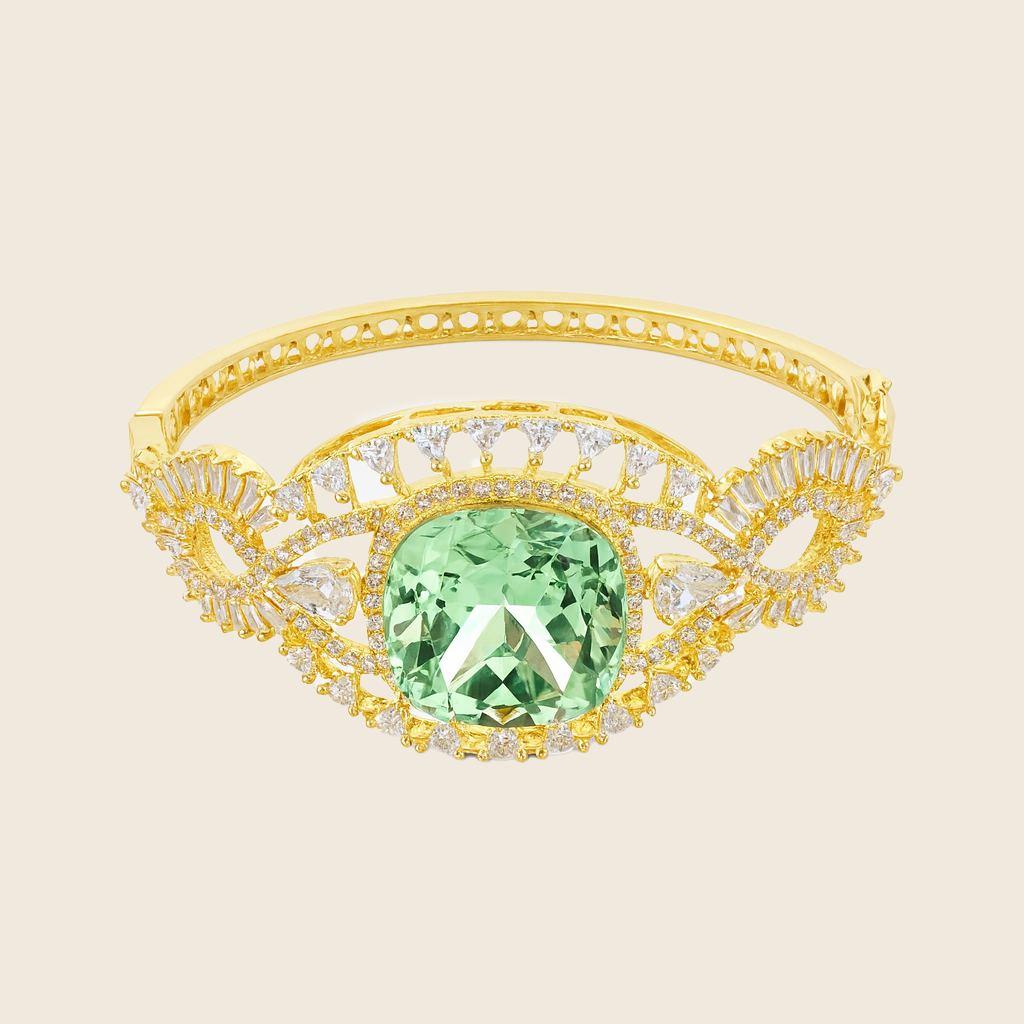 The Aanura Emerald Royale Gold Bracelet is a stunning creation of regal elegance. Crafted in premium stainless steel with a radiant gold finish, it showcases a bold cushion-cut green gemstone surrounded by an intricate diamond-studded lattice and teardrop crystal accents for a truly royal look.