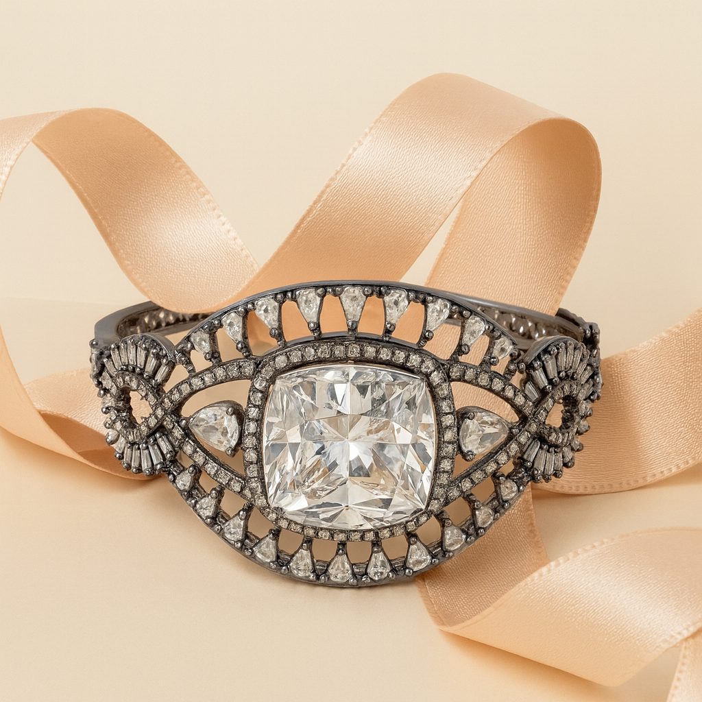 with emerald and CZ diamond embellishments - Design: Royal lattice-style bracelet with bold centerpiece