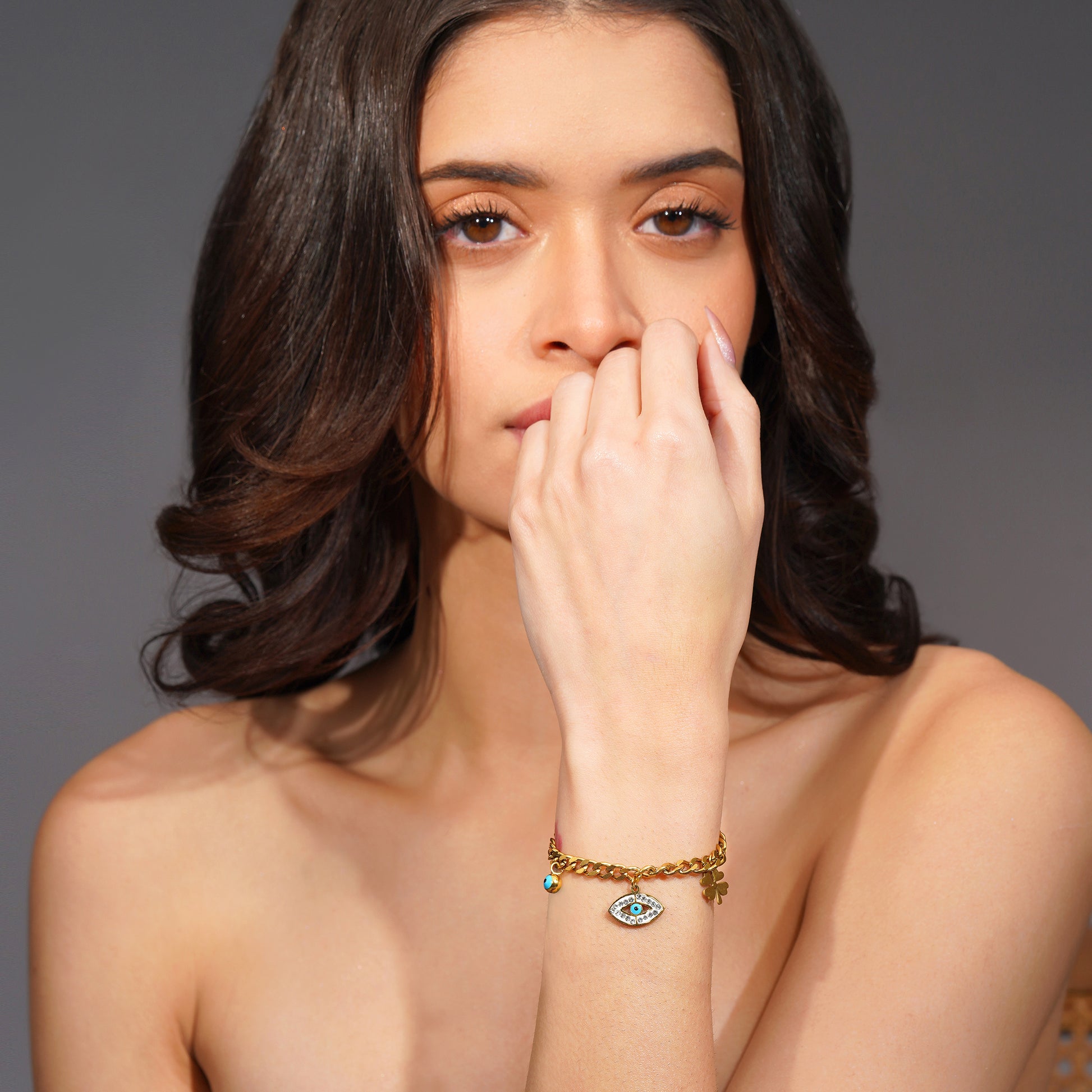 The evil eye symbolizes protection and warding off negative energy, while charms represent luck, positivity, and personal strength. This bracelet reflects confidence, balance, and mindful elegance.