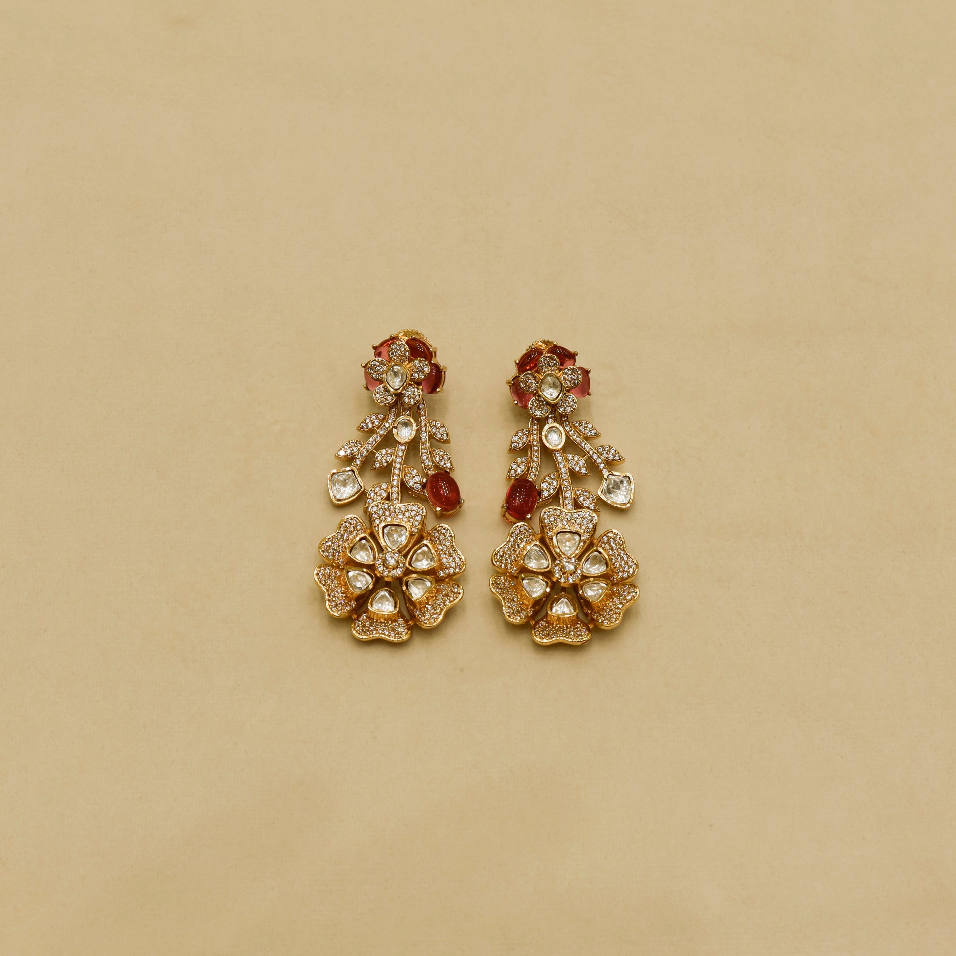 The Aanura Floral Kundan Bridal Necklace Set is a true statement piece crafted for grand occasions. Adorned with floral motifs, shimmering kundan stones, and ruby red accents, this masterpiece radiates elegance and opulence. Matching statement earrings make it a complete bridal ensemble.