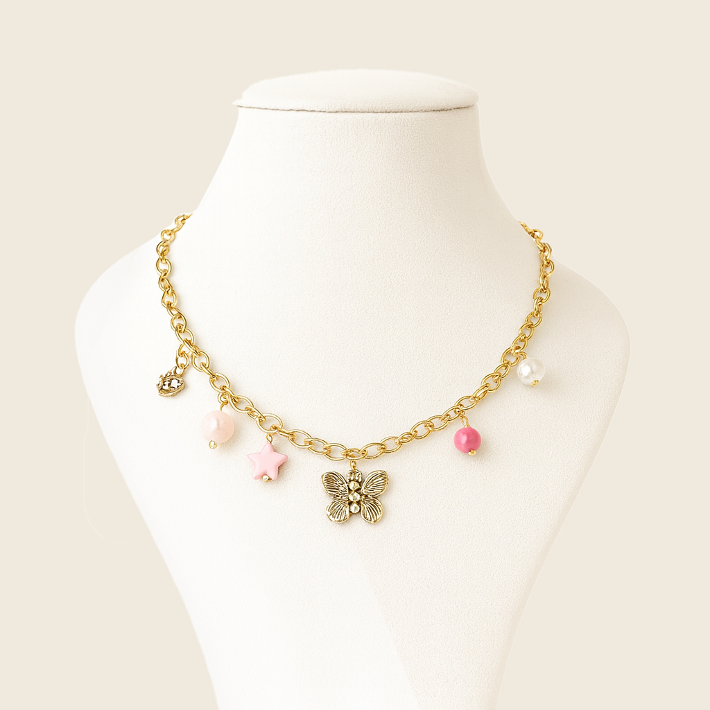 This delightful gold charm necklace features a mix of whimsical pendants, including a butterfly centerpiece, pink star beads, pearl, and floral charms, creating a playful yet elegant accessory.