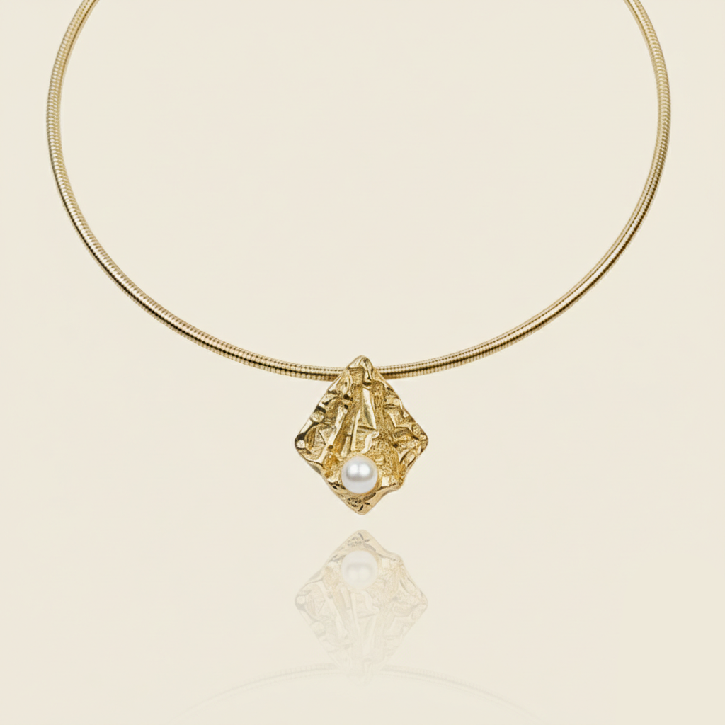 This elegant gold choker necklace features a textured pendant adorned with a lustrous pearl. A modern yet timeless piece to enhance your jewelry collection.