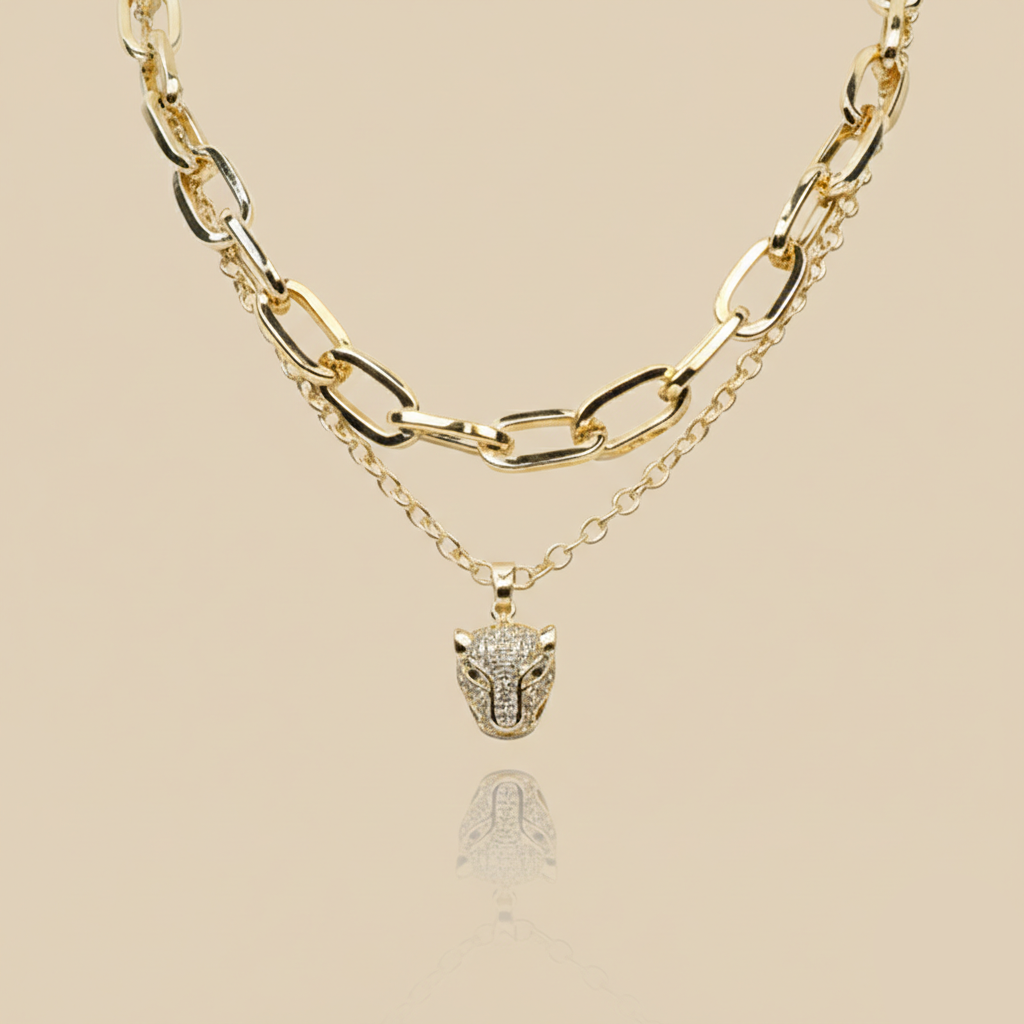 This necklace blends edgy animal-inspired design with a luxe layered chain style. The gleaming gold finish and crystal details make it ideal for high-fashion looks, evening glamour, or elevating casual ensembles.