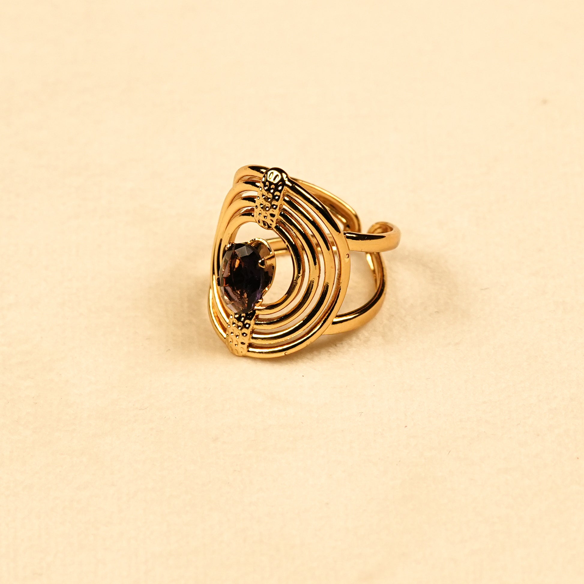 This contemporary adjustable ring showcases an artistic abstract swirl design centered around a striking oval-cut stone. The layered openwork structure creates depth and fluid movement, while the polished gold-tone finish enhances its bold yet elegant appeal. Designed for modern women who appreciate statement accessories, this ring blends artistic expression with everyday wearability.