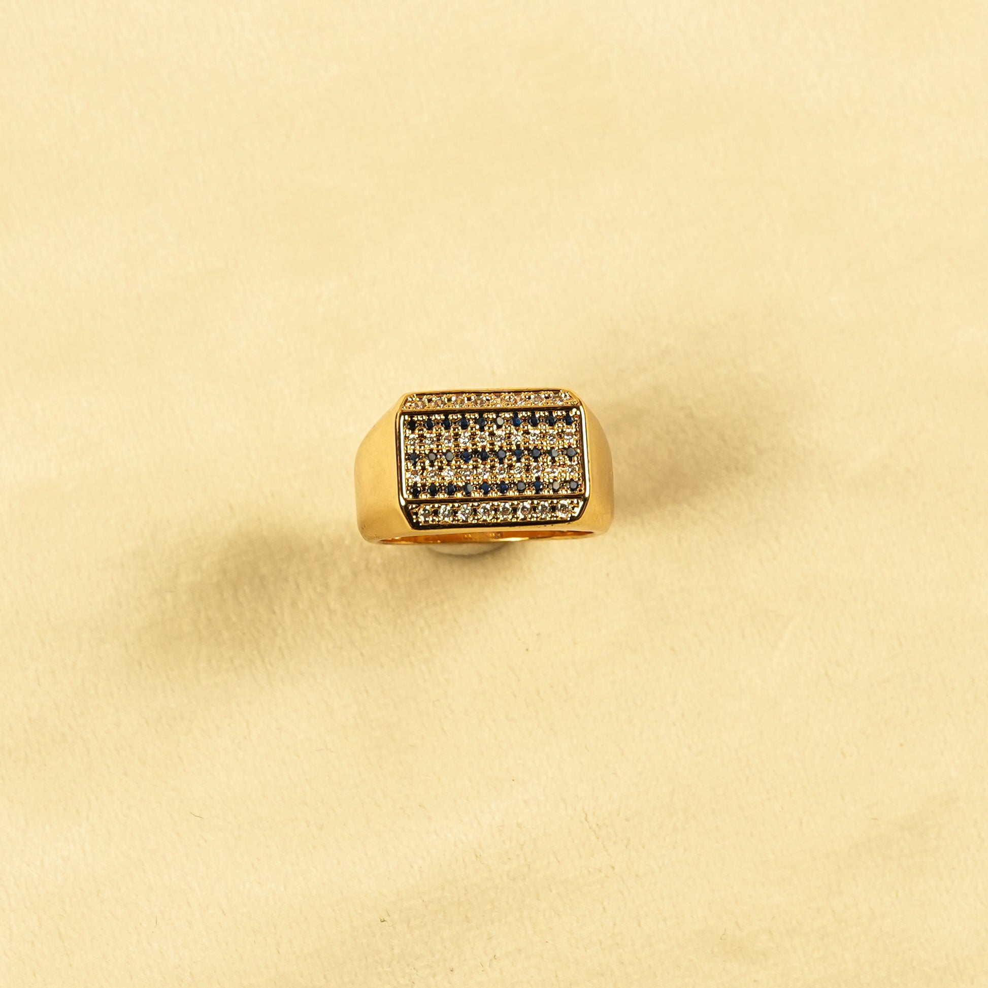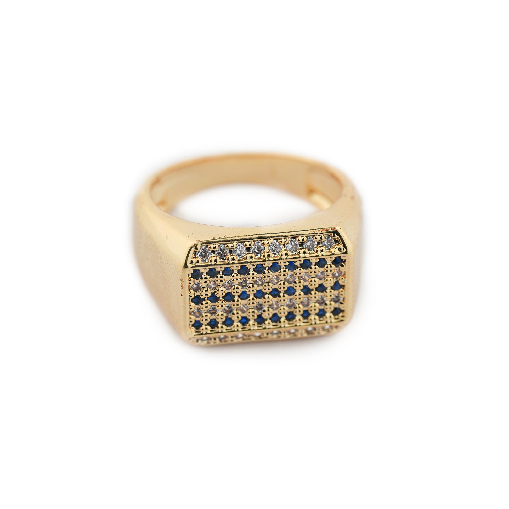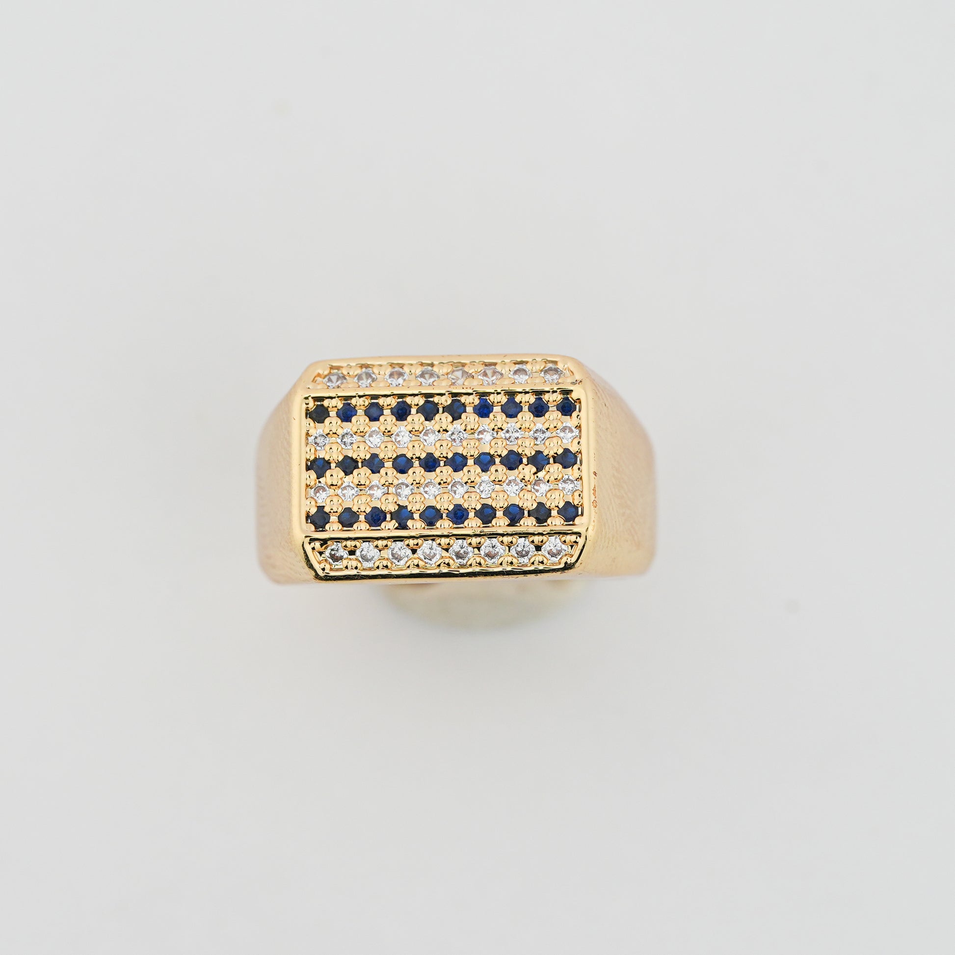 This classic contemporary statement ring features a bold rectangular face with a detailed grid pattern, highlighted by deep blue crystal accents and clear crystals along the top edge. Finished in a rich matte gold tone, the ring combines strong geometry with refined detailing, making it ideal for modern styling and confident everyday wear.