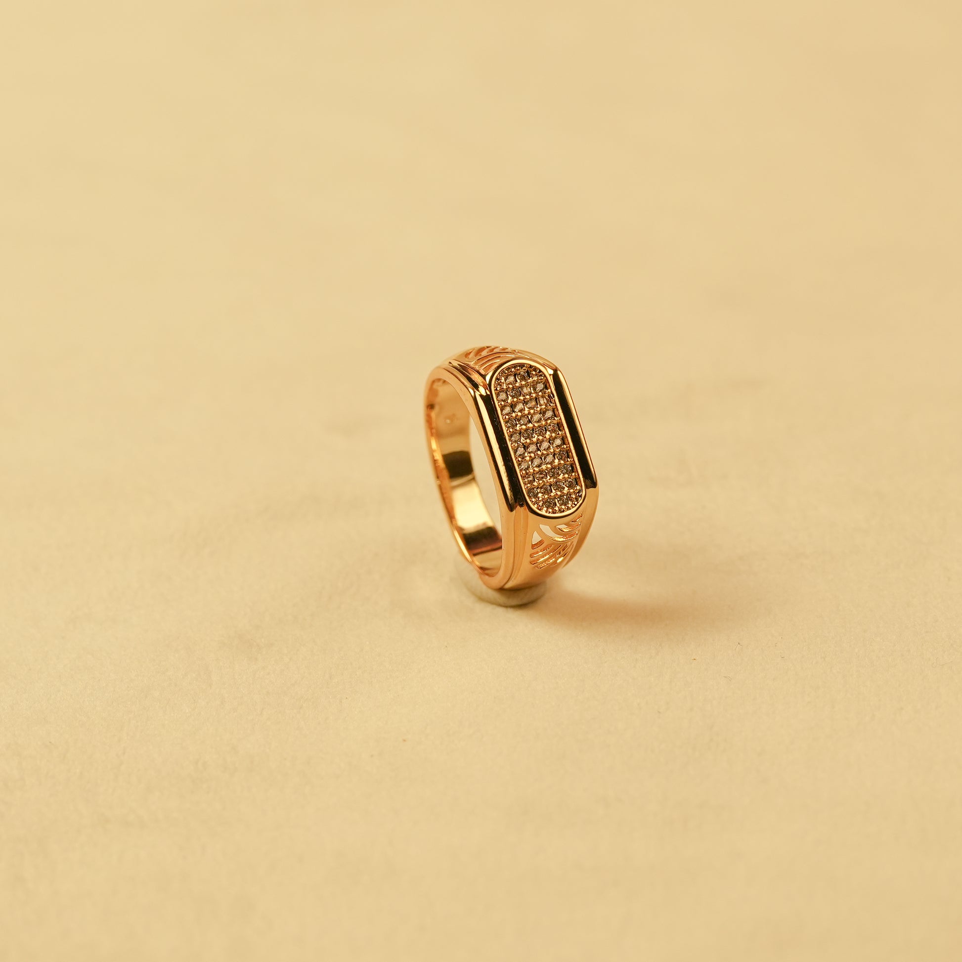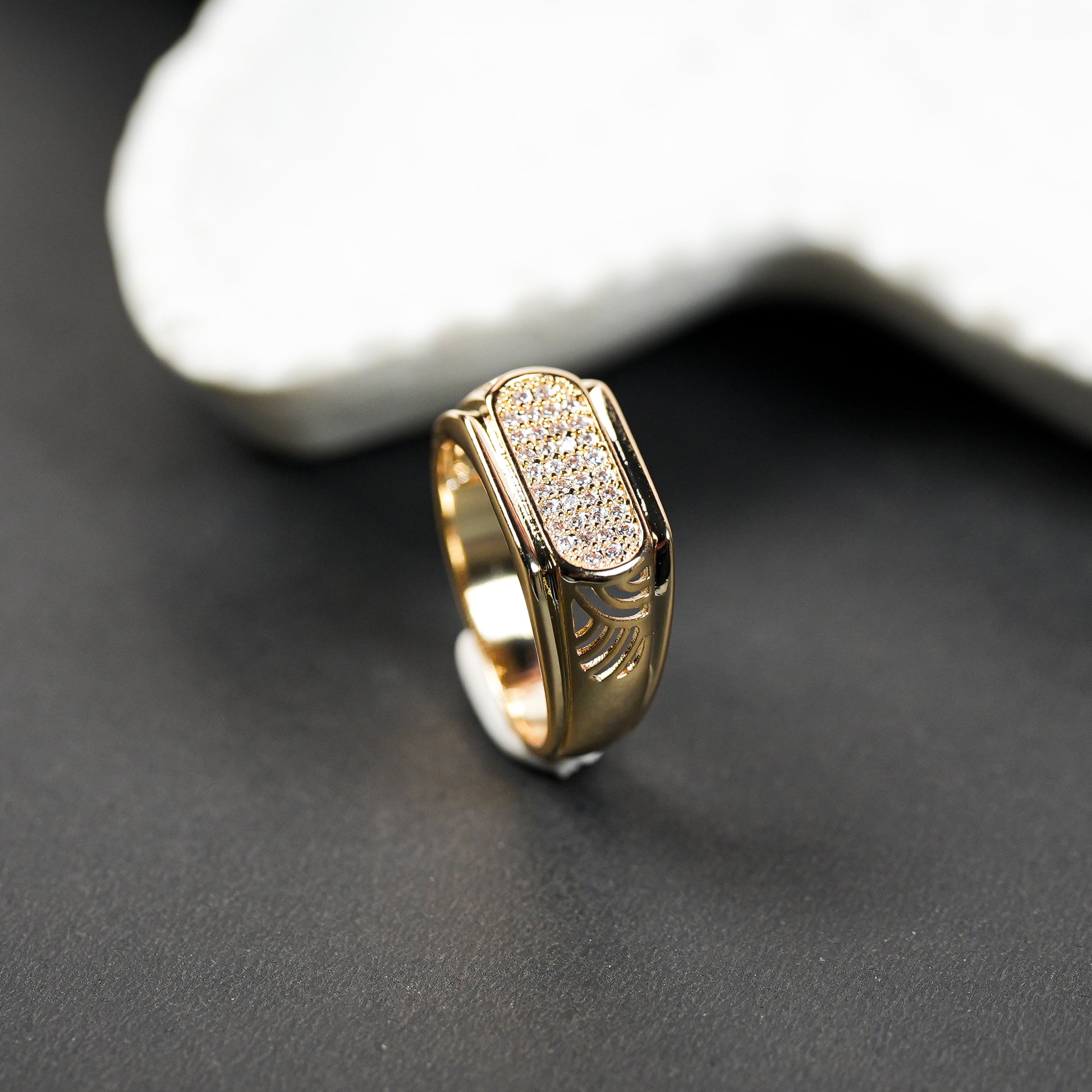 This classic contemporary statement ring features a refined rectangular face densely set with shimmering clear crystal accents, framed by a smooth gold border. The band showcases elegant cutwork detailing on both sides, adding depth and craftsmanship to the design. Finished in a rich gold tone, this ring balaLJes luxury and wearability—making it perfect for confident everyday styling and special occasions.