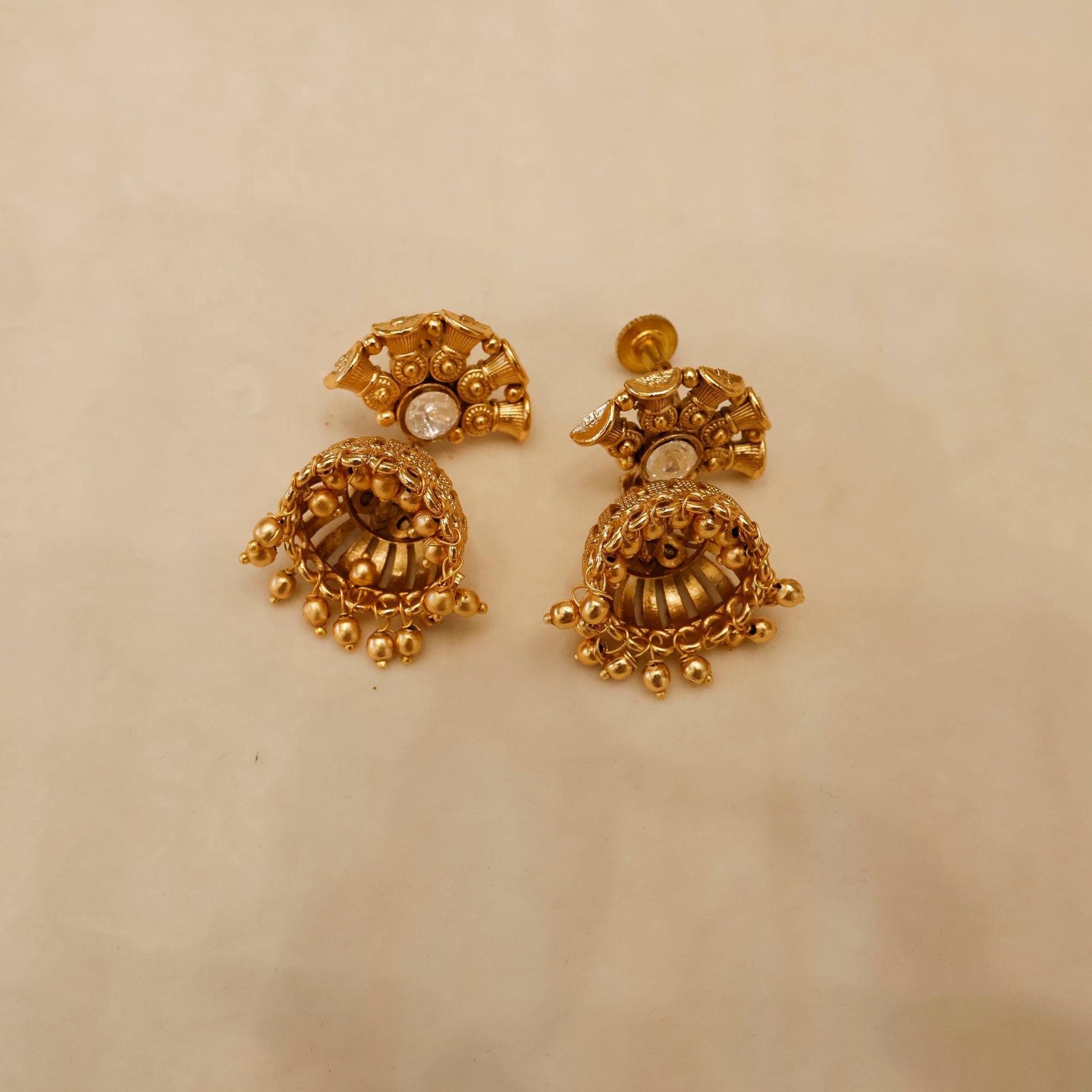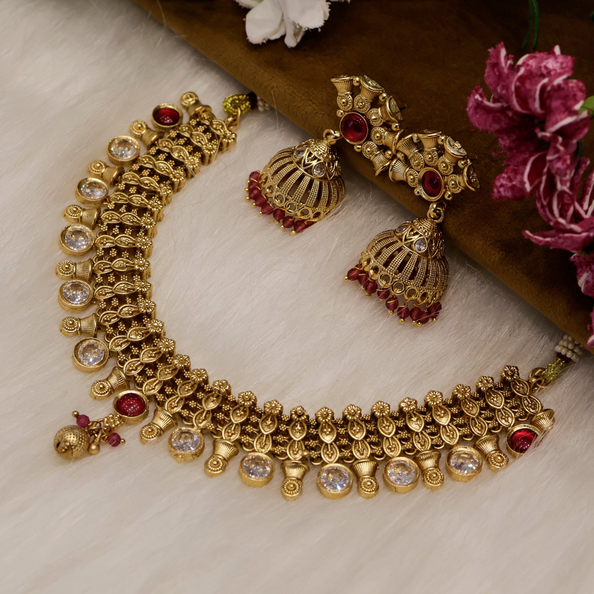 Elevate your festive elegance with the Aanura Jewellery Gold-Plated Kundan Necklace & Earrings Set. Featuring a choker-style necklace adorned with round kundan stones and intricate antique gold detailing, this set is completed with matching jhumka earrings embellished with layered bead hangings. The timeless design reflects the richness of heritage craftsmanship with a modern touch.