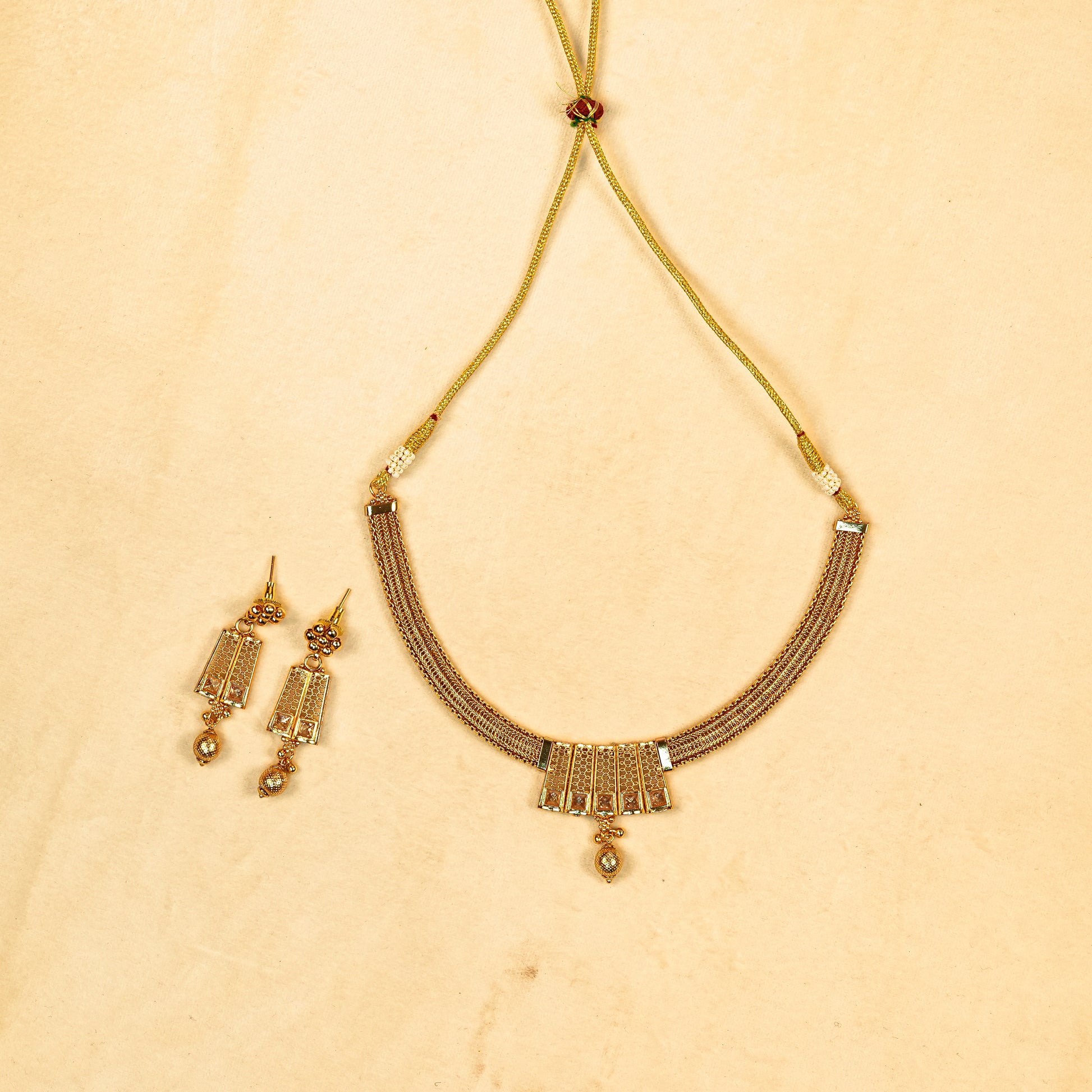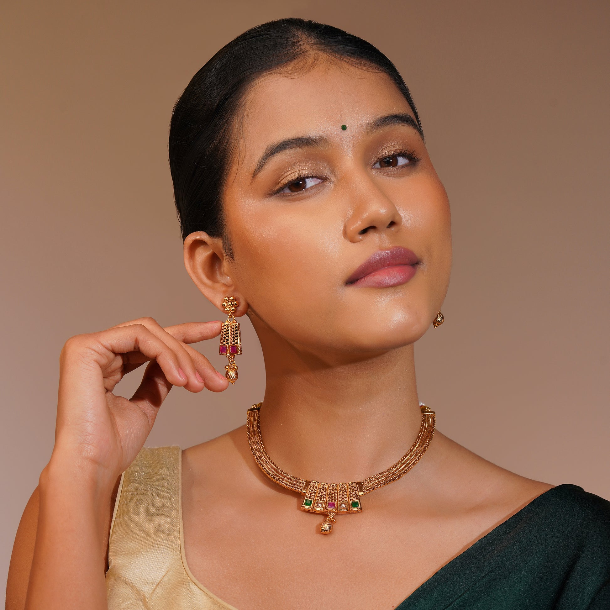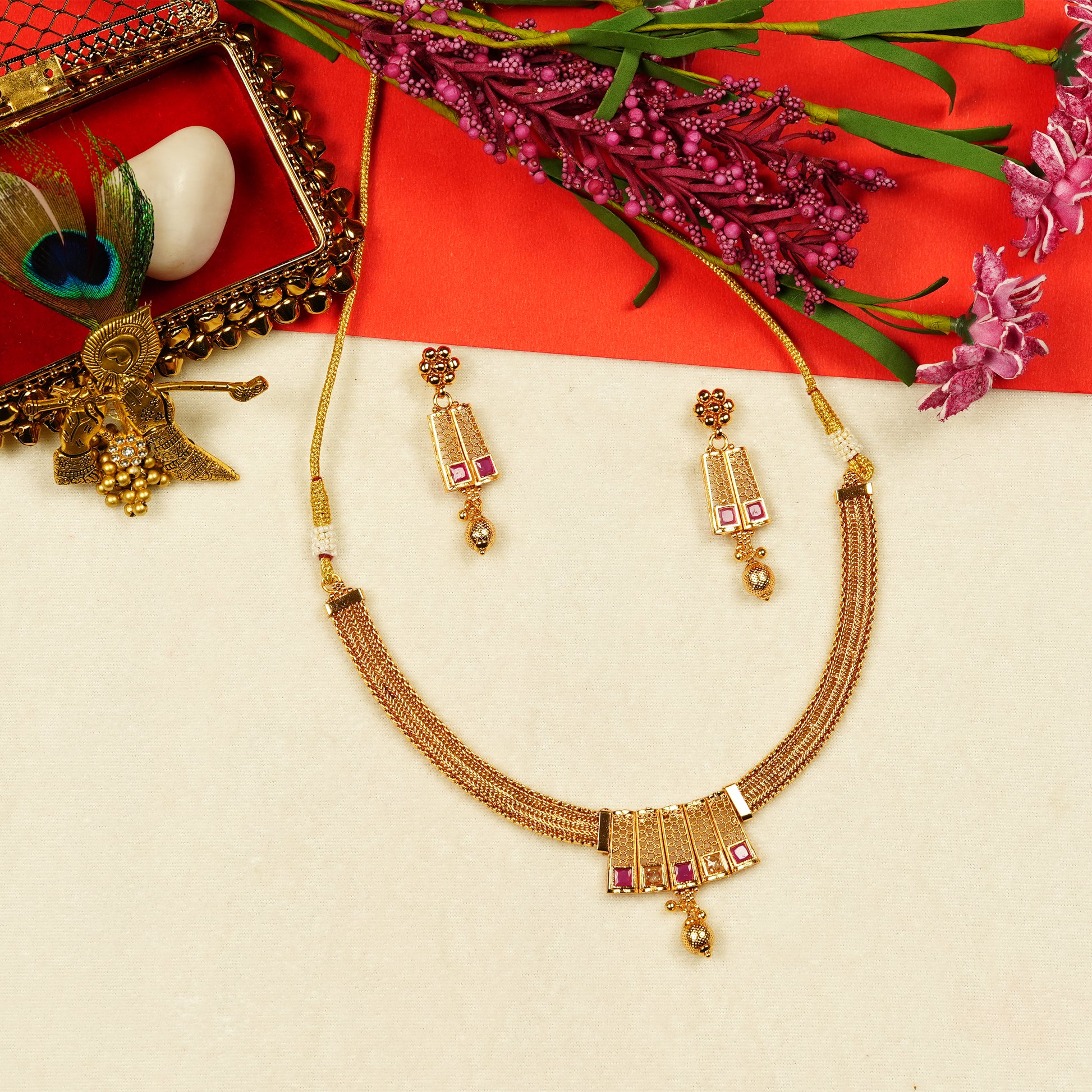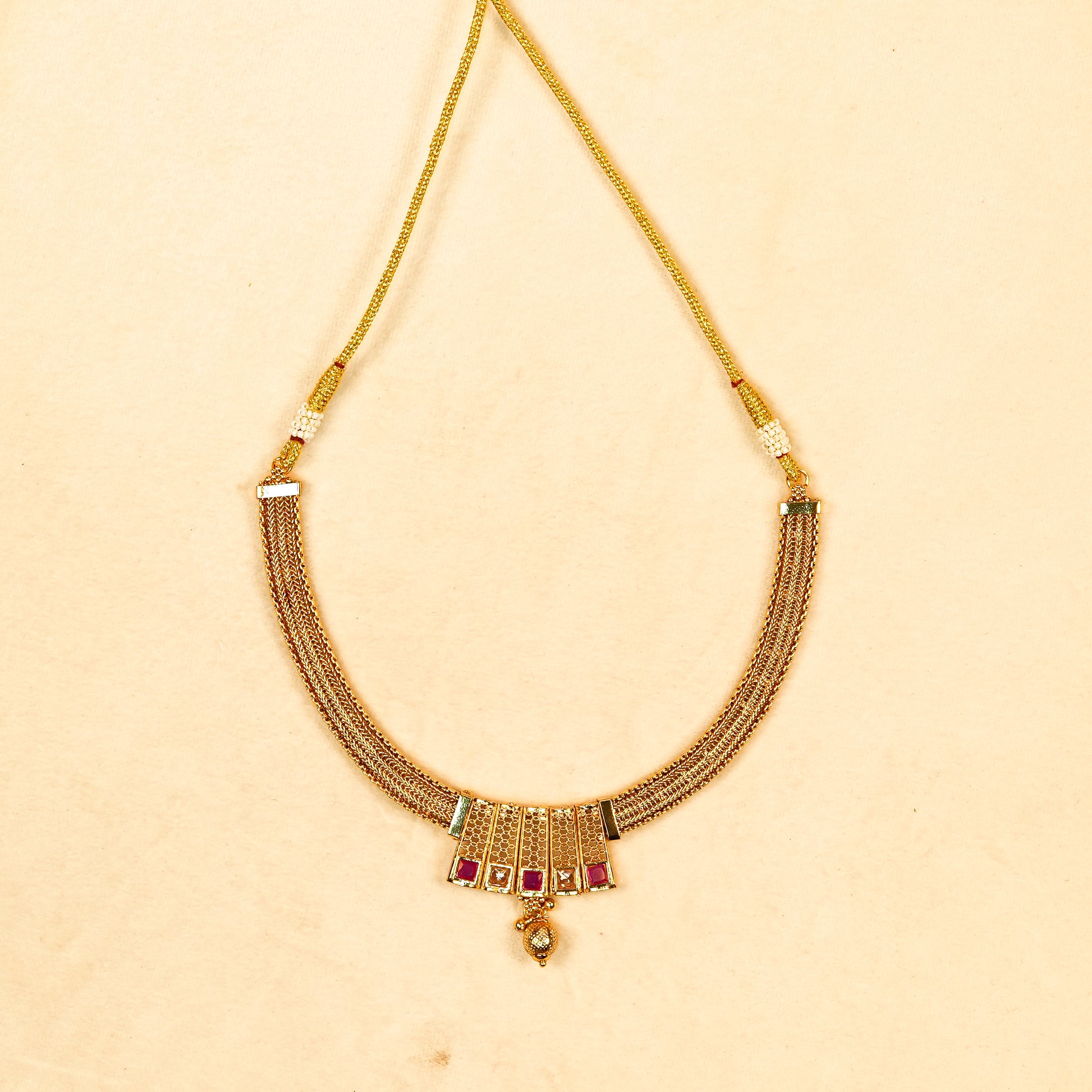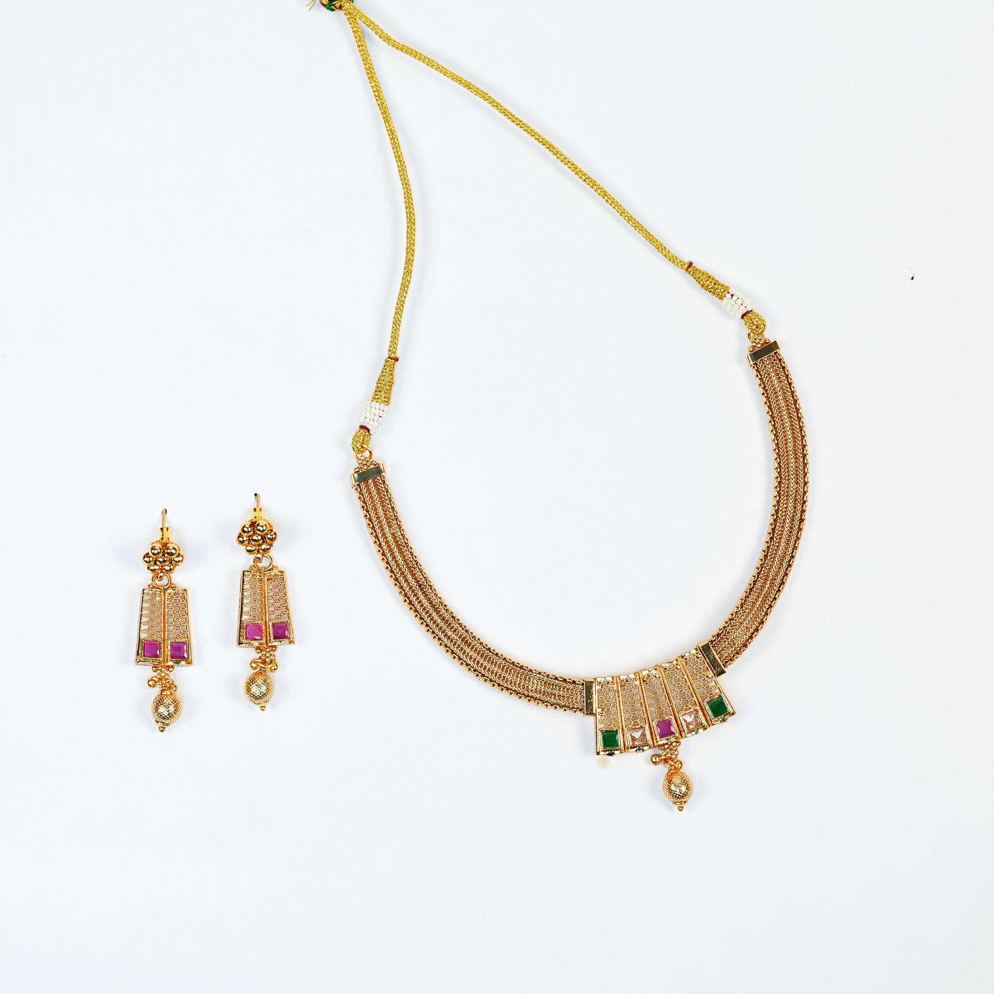 The structured multi-chain arrangement creates a balanced silhouette, while the ornate centerpiece adds a touch of traditional charm. Finished with a smooth gold-plated surface, this set blends classic craftsmanship with understated sophistication, making it ideal for festive and ceremonial wear.