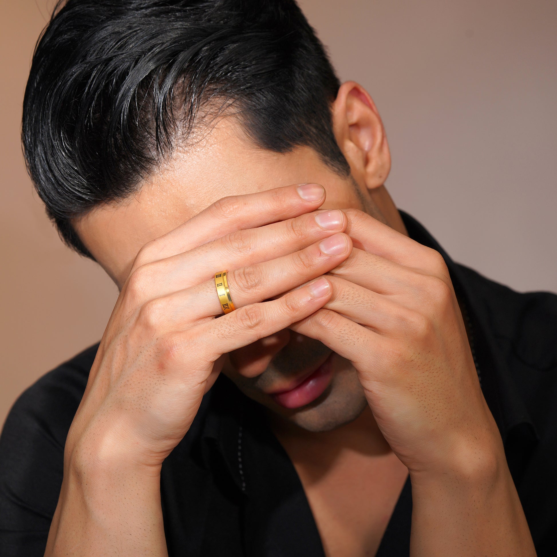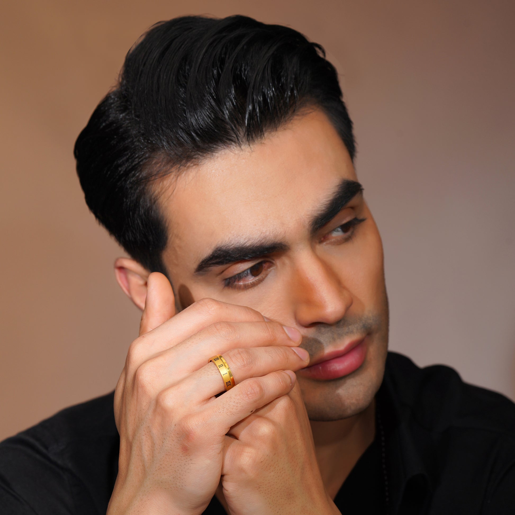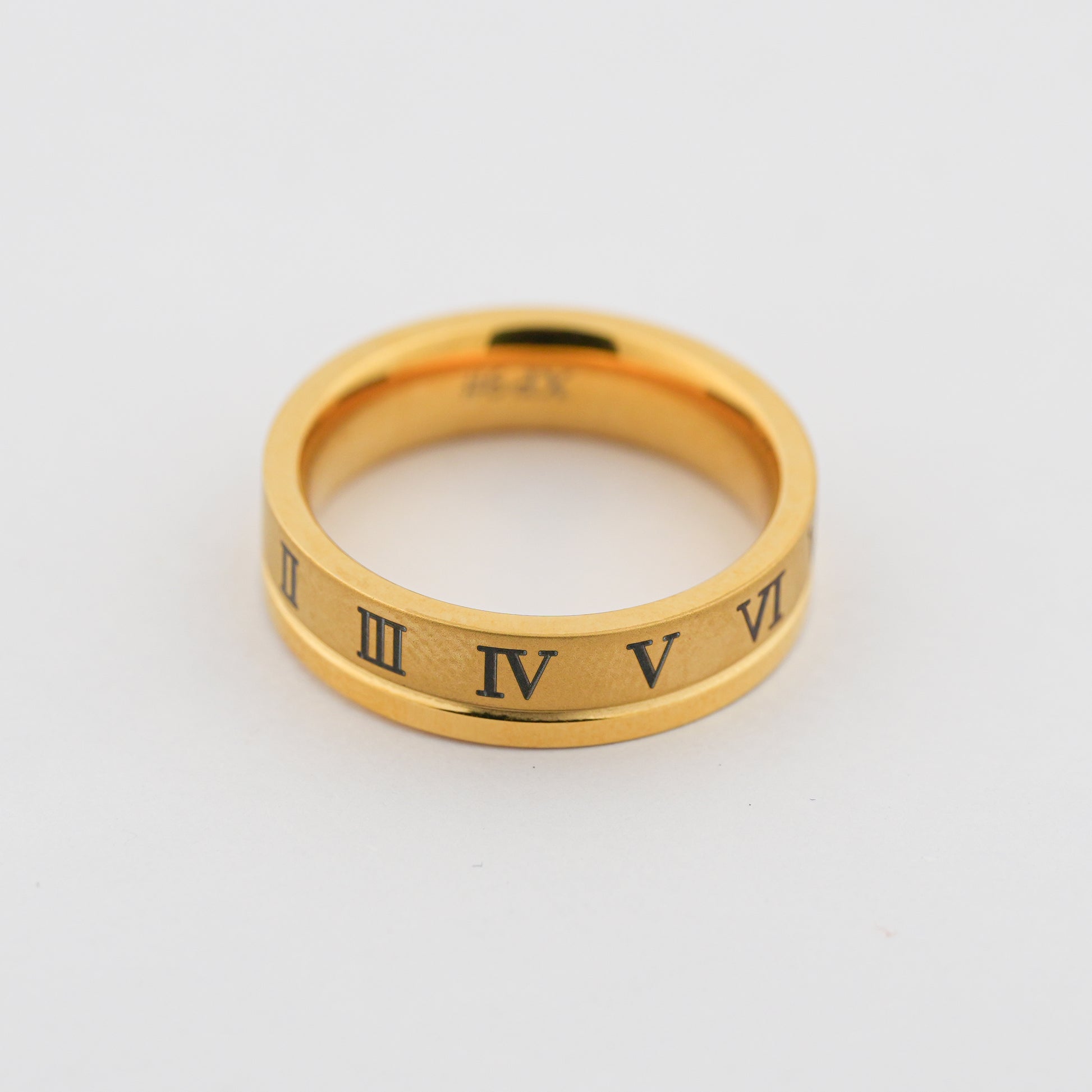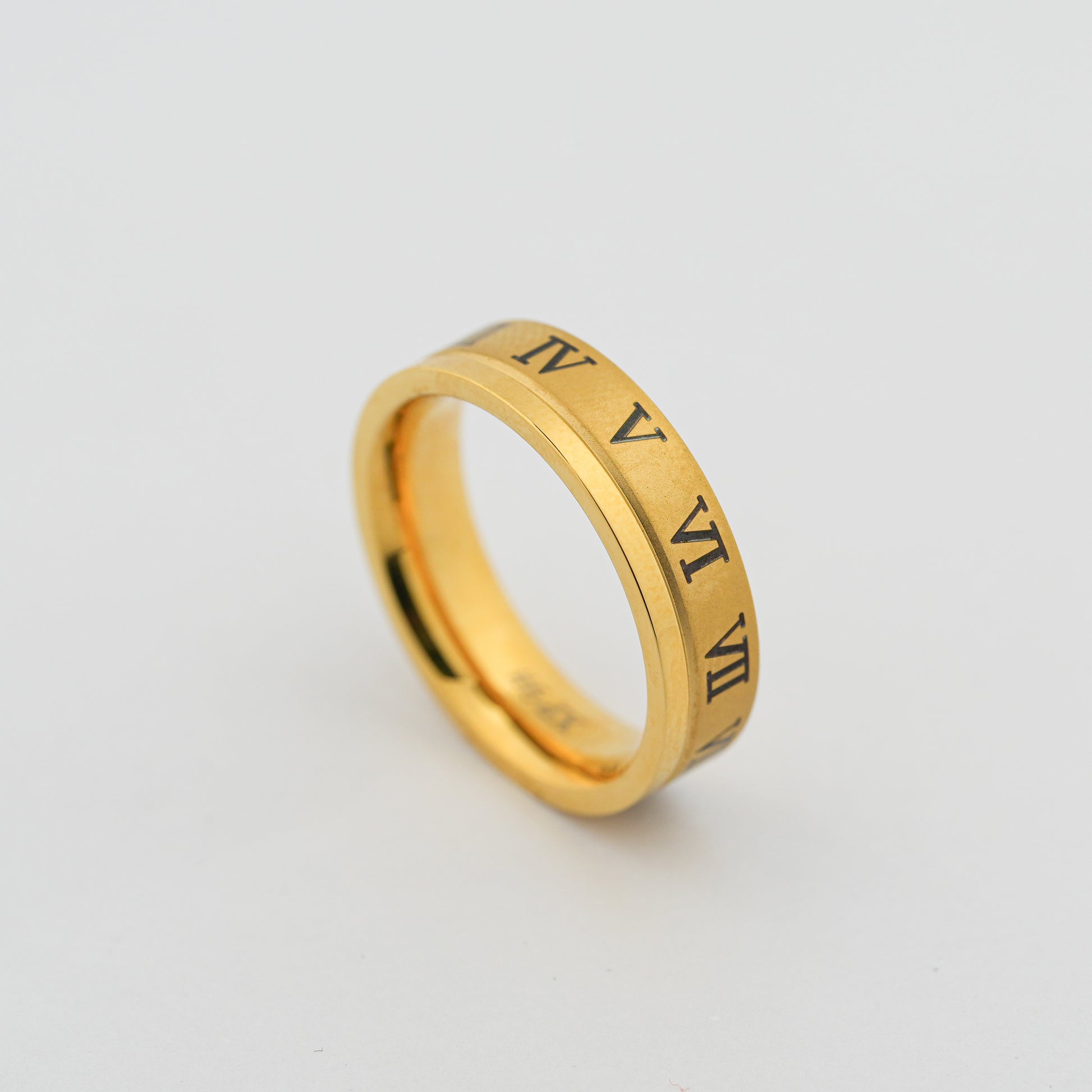 This classic contemporary ring features a rich matte gold finish accented with engraved black Roman numerals around the band. Designed with clean edges and a bold yet refined aesthetic, this ring blends modern minimalism with symbolic detailing, making it ideal for everyday wear and statement styling.