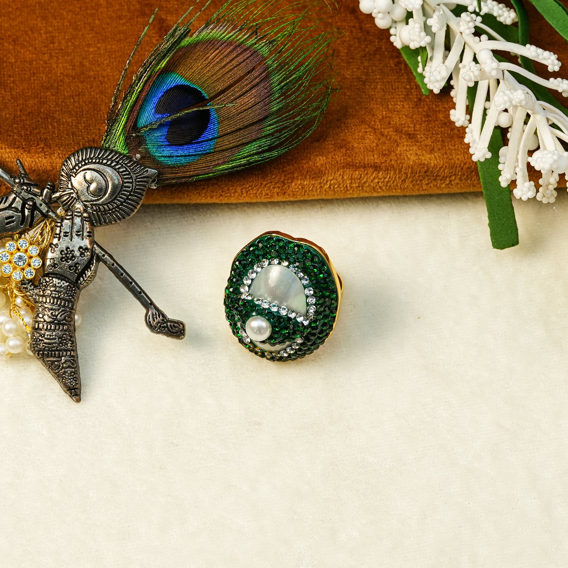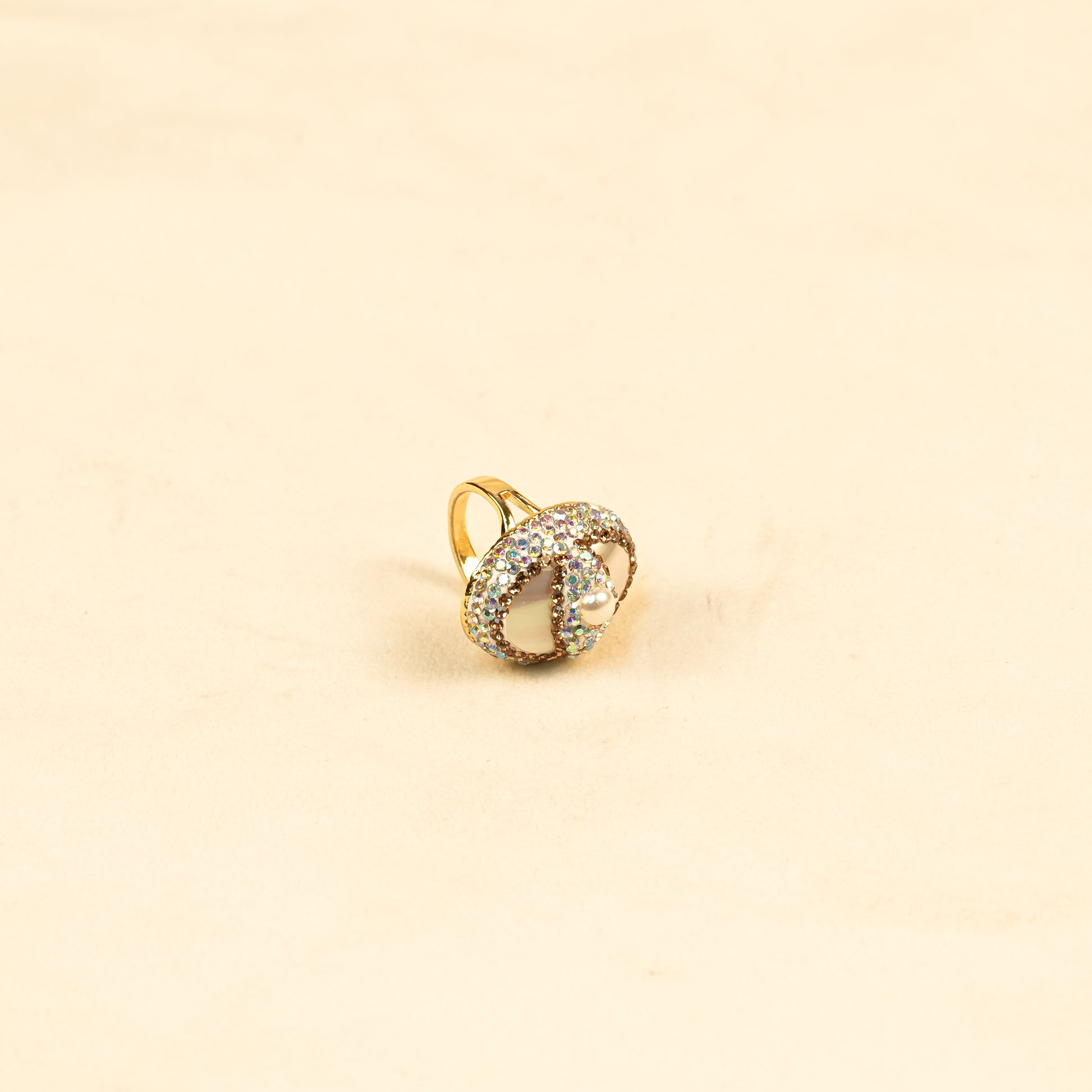 This elegant statement ring features a sculpted dome centerpiece accented with a smooth pearl detail and surrounded by finely set CZ stones for added texture and brilliance. Designed with a bold yet refined profile, the ring delivers a luxurious presence while maintaining balance and sophistication. Finished in a rich gold tone with an adjustable band, this piece is crafted for confident, expressive styling.
