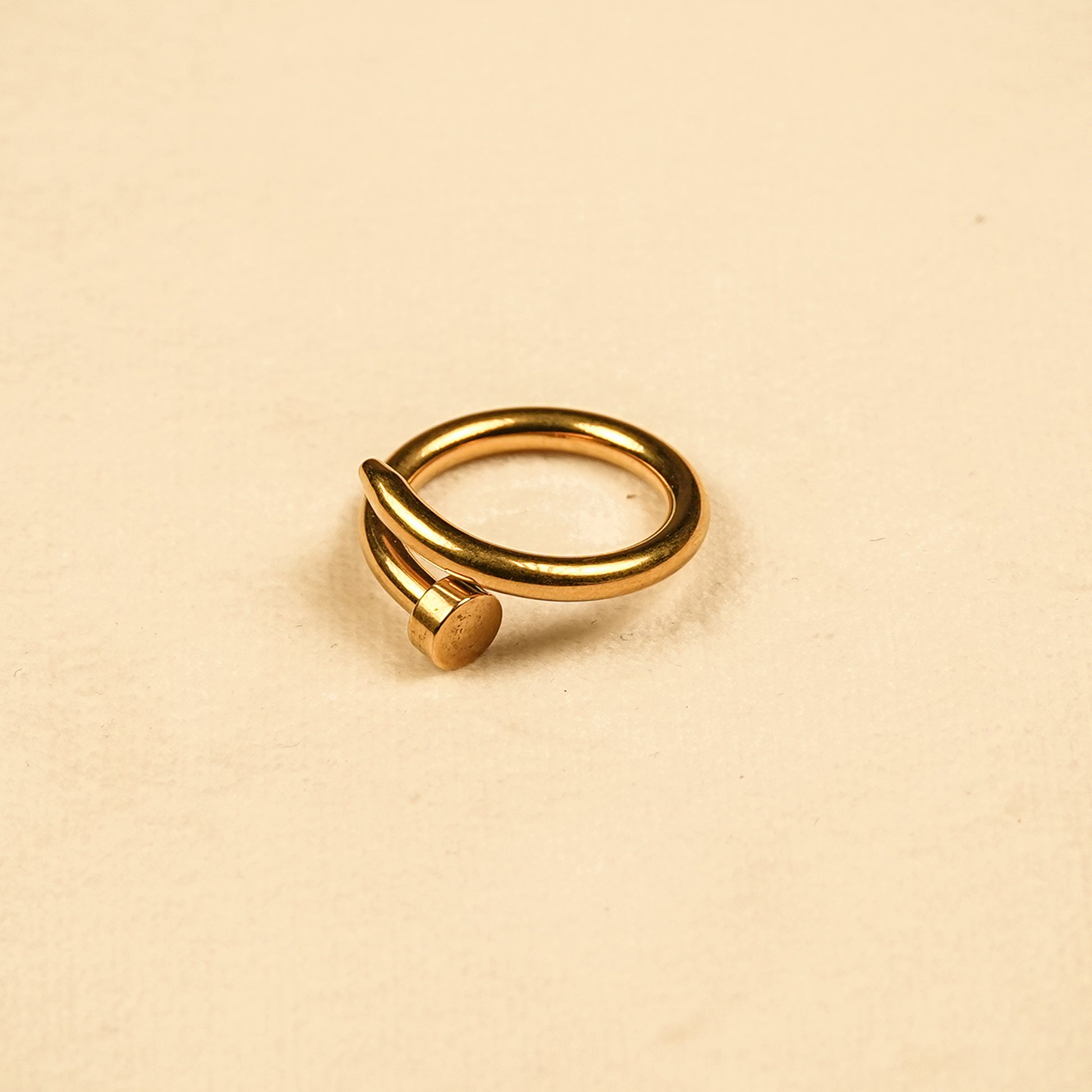 This bold Aanura ring showcases a contemporary nail-inspired silhouette with a smooth circular band and rounded head detail. Crafted with a clean, minimal aesthetic, the design blends modern edge with refined elegance. Its polished gold tone finish makes it a striking yet versatile piece, perfect for women who appreciate statement jewellery with a subtle industrial touch.