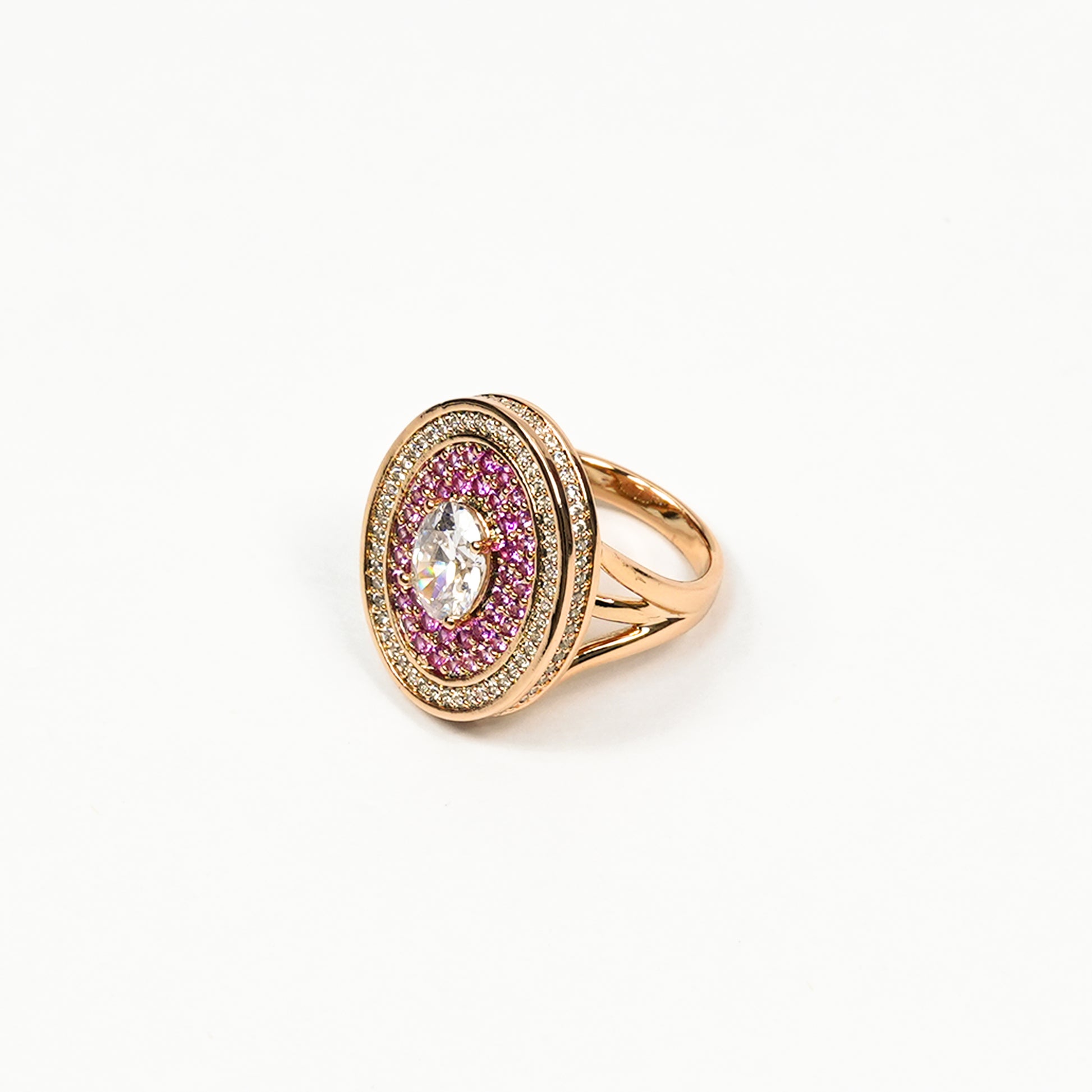 This elegant Aanura ring features a striking oval-cut clear crystal at the center, surrounded by a vibrant pink crystal halo and bordered with fine accent crystals for added brilliance. The layered oval design creates depth and luxury, while the polished gold-tone finish enhances its regal appeal. Crafted for women who love bold yet refined jewellery, this ring is a perfect blend of glamour and sophistication.