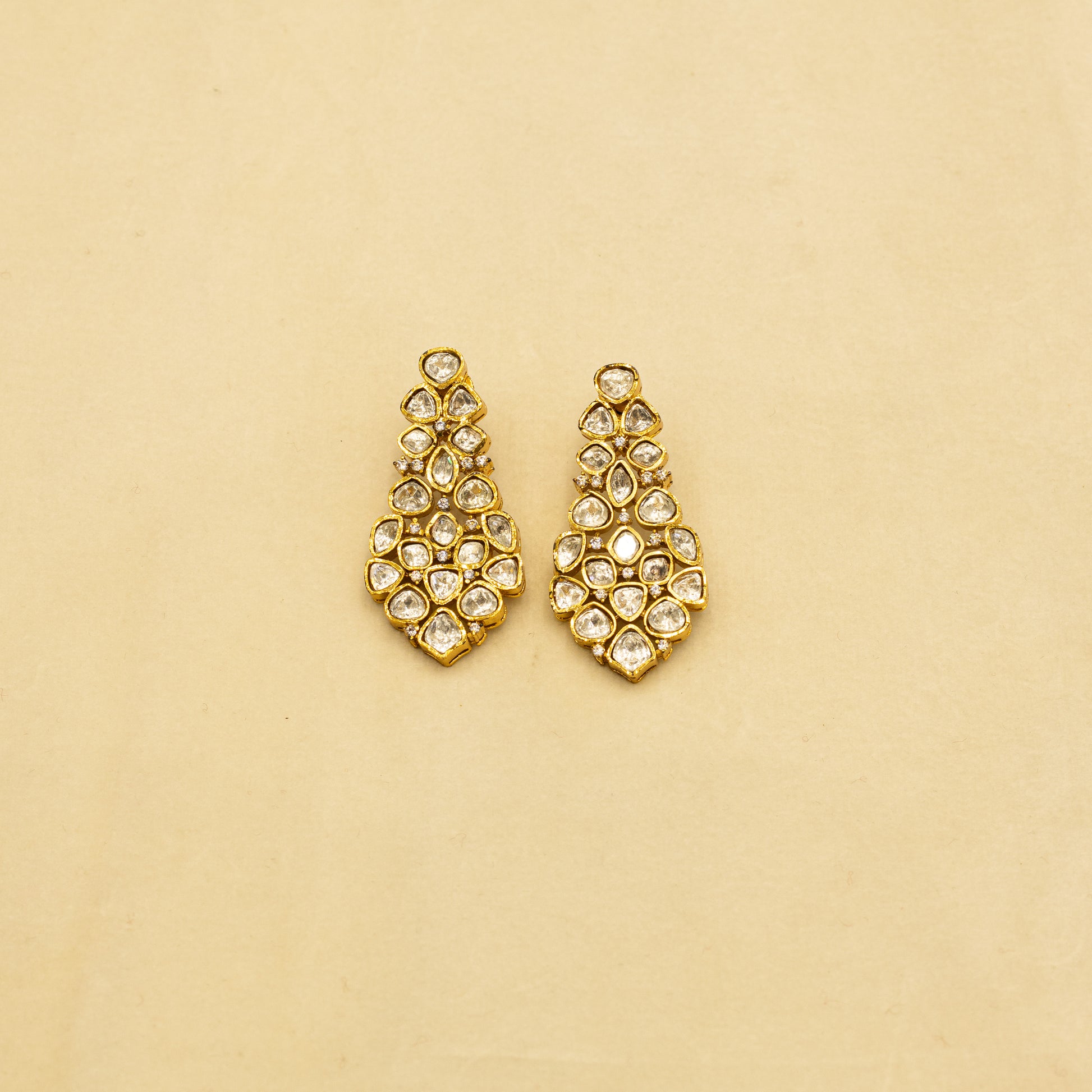 The Aanura Grand Kundan Choker is a breathtaking statement piece featuring layered teardrop kundan stones, arranged in a regal choker style. Its shimmering brilliance and wide coverage make it a favorite for brides seeking a royal look. Paired with bold matching earrings, this set radiates timeless heritage charm.
