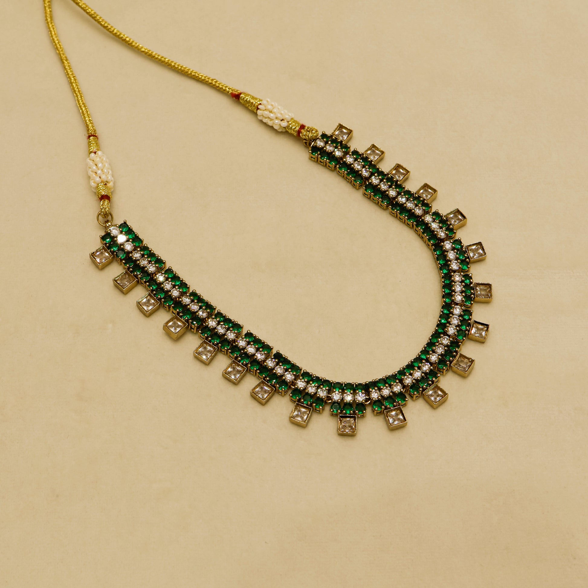 The Aanura Green Beaded Choker Necklace Set is a blend of regality and modern design. With multiple rows of emerald green beads and kundan square embellishments, this choker radiates a royal charm. The matching earrings complete the set, making it ideal for grand occasions.
