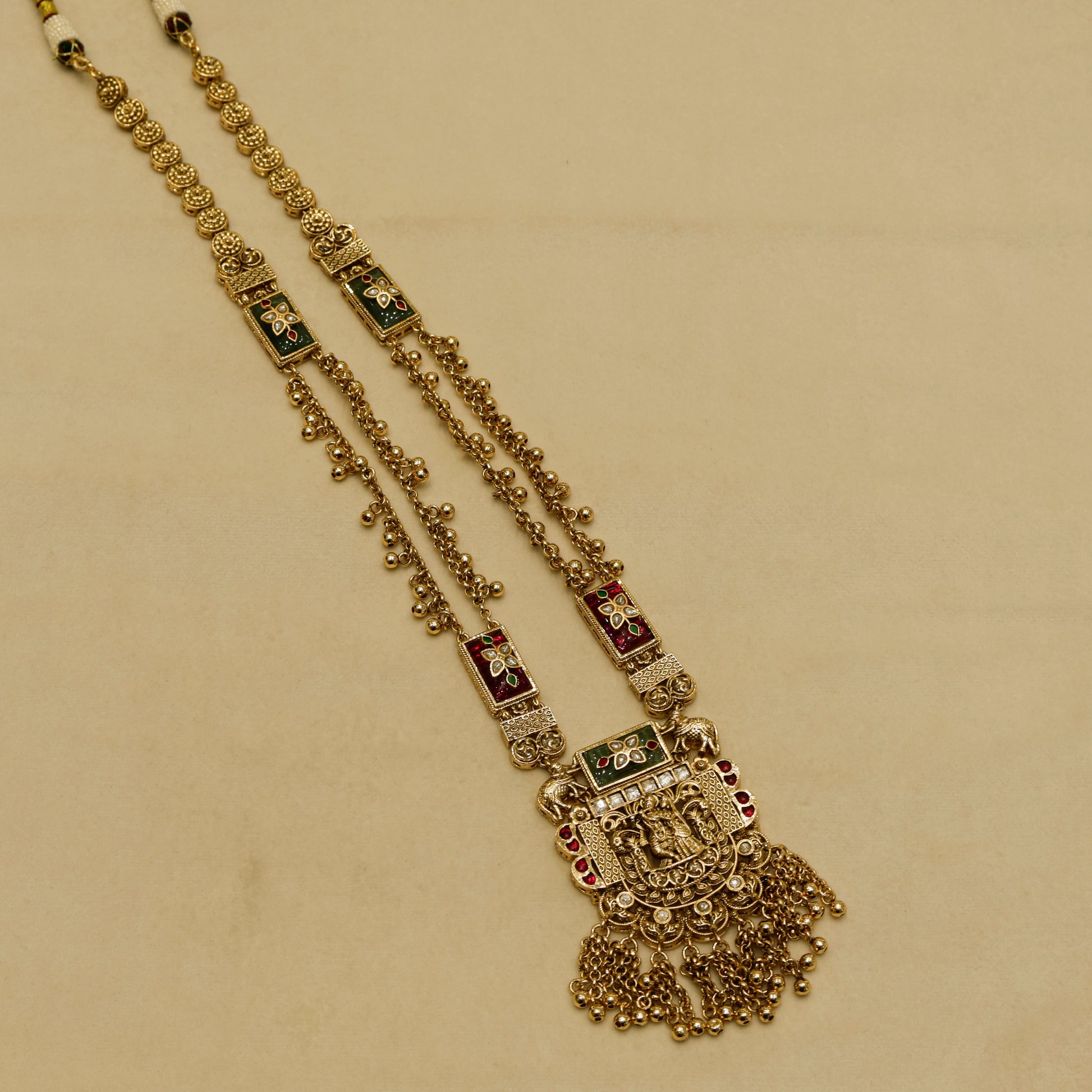 The Aanura Heritage Temple Necklace Set is a divine masterpiece showcasing the grandeur of traditional temple jewellery. Featuring an intricately carved Krishna motif at the pendant center, this design is surrounded by antique patterns, kundan inlay, and dangling gold beads. The long dual-layered chain is detailed with rectangular gemstone accents, while the pendant flows into ornate golden tassels. Matching jhumka-style earrings complete the regal look.