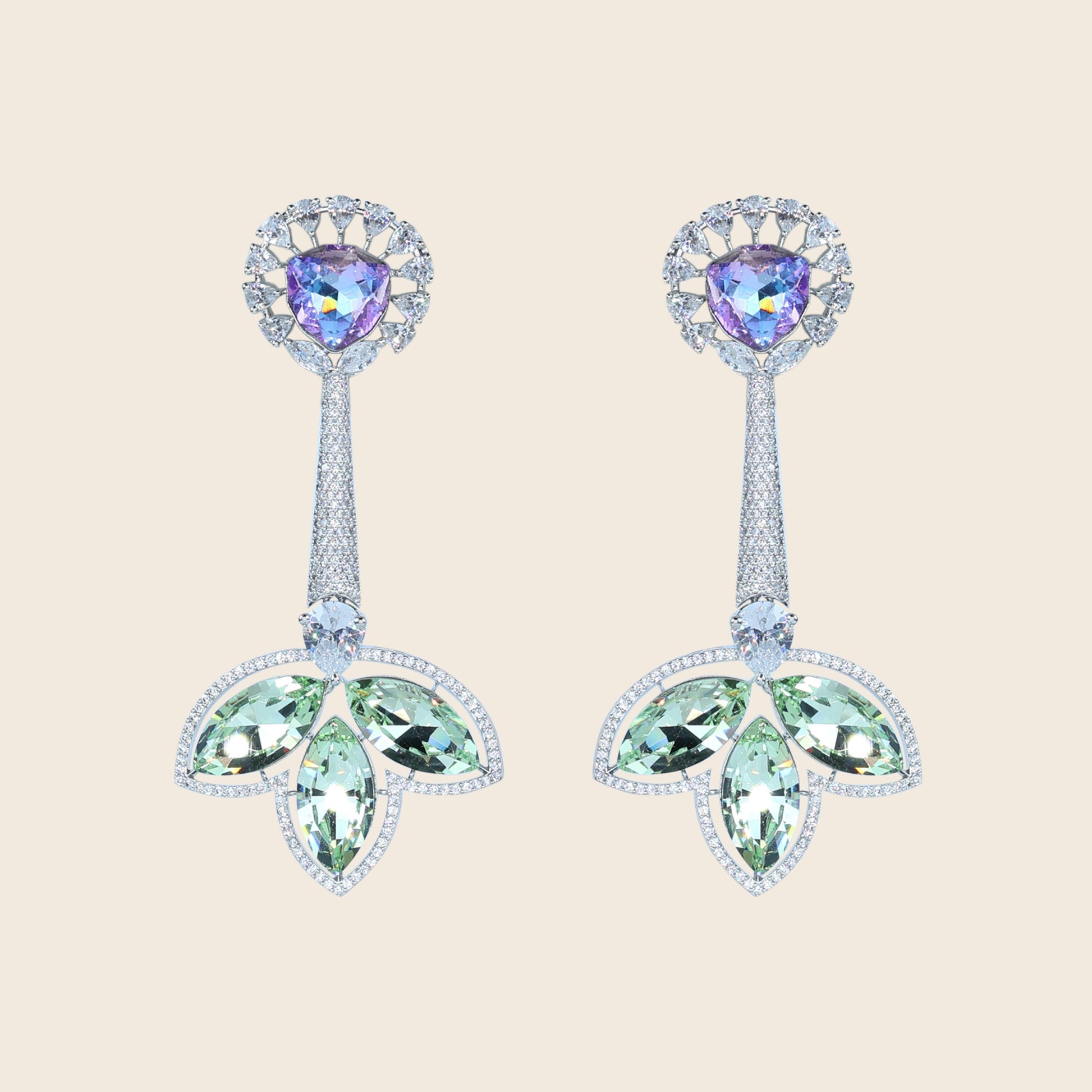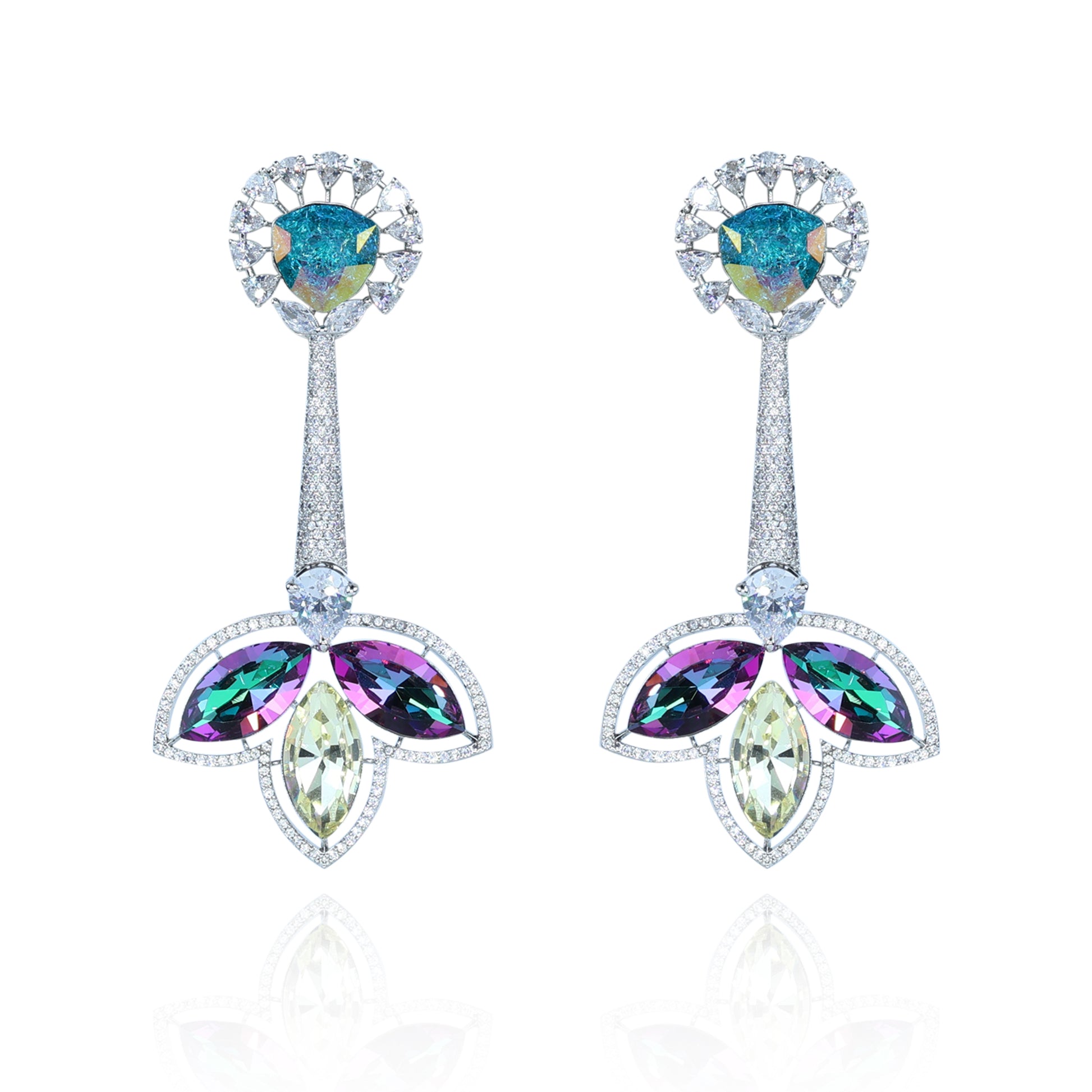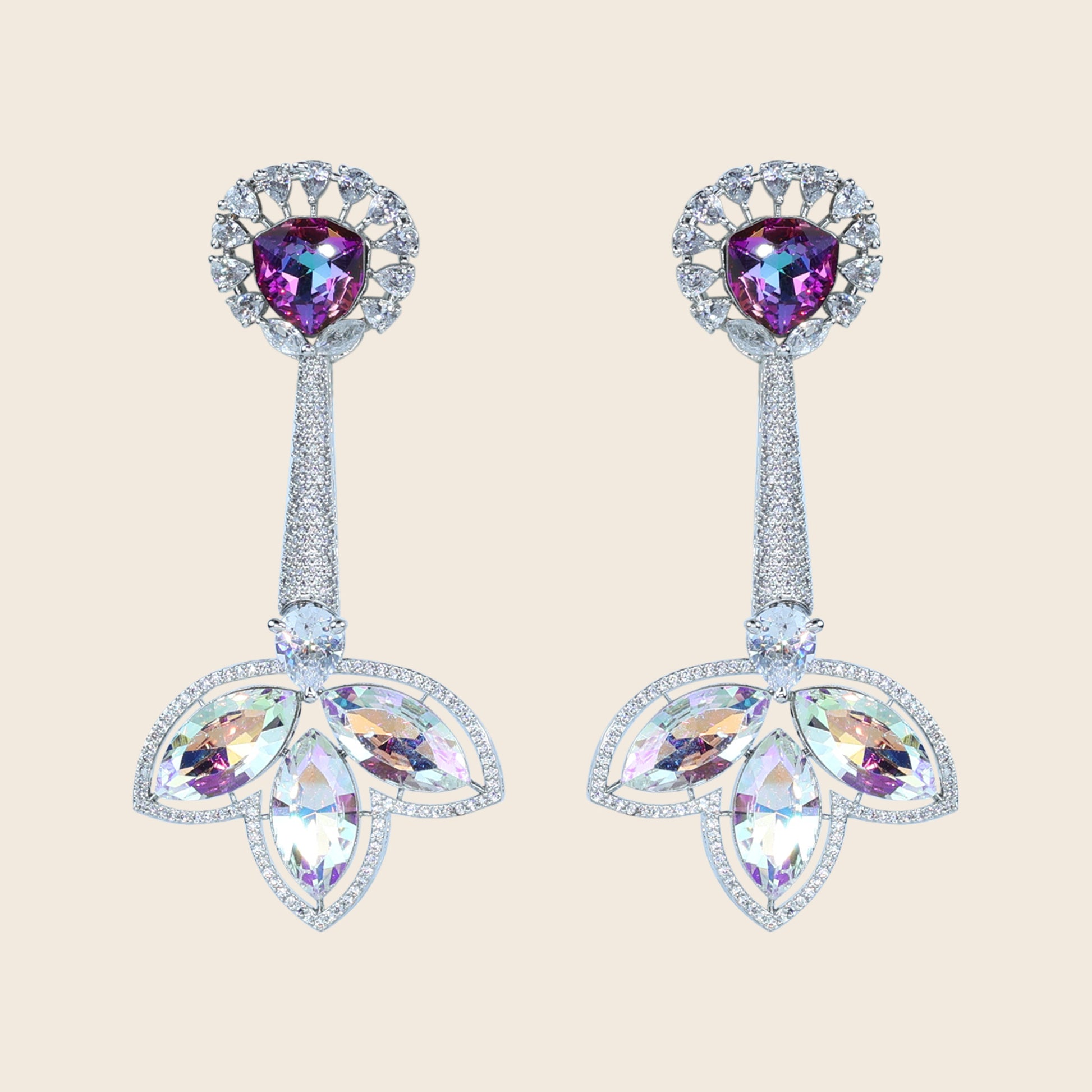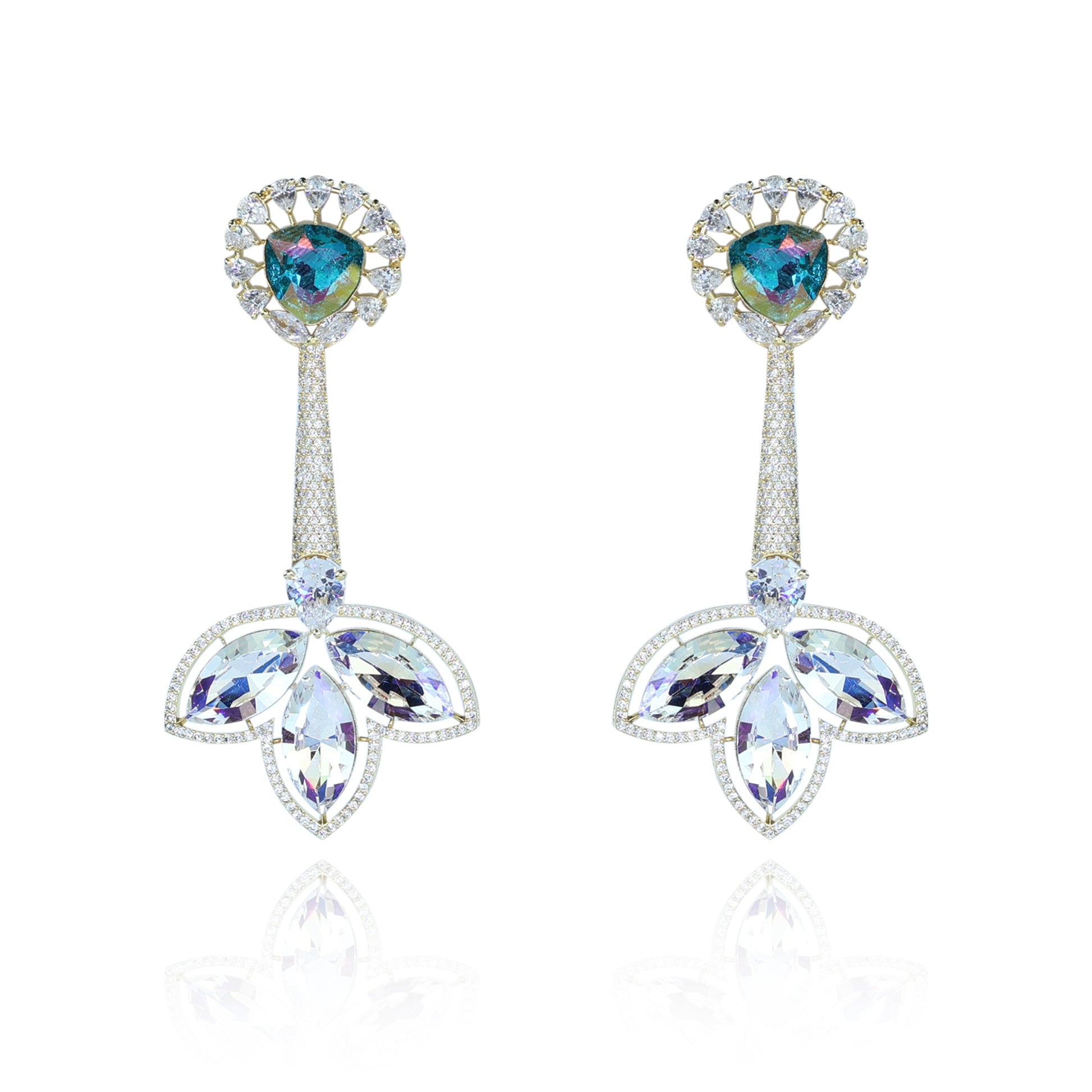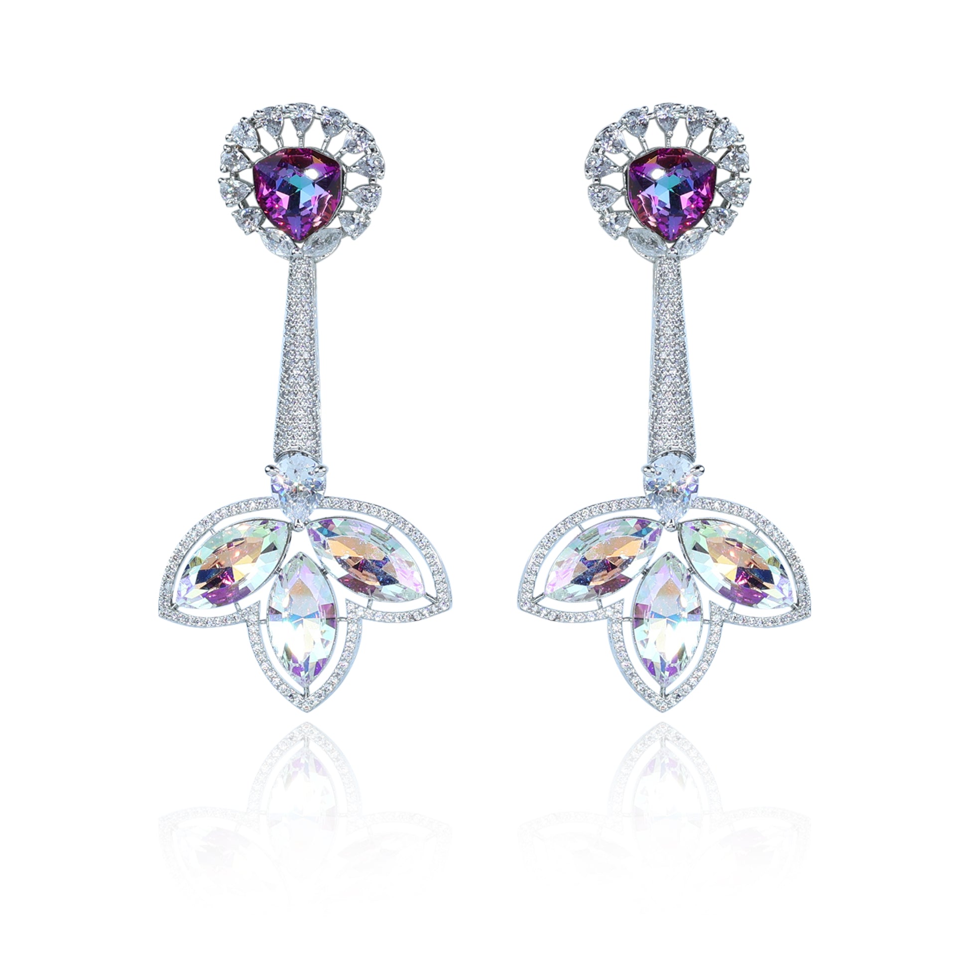 The earrings blend modern luxury with floral inspiration. The iridescent gemstone adds a magical play of colors, while the marquise floral CZ design creates a dazzling finish. Their elongated style frames the face beautifully, making them perfect for evening wear.