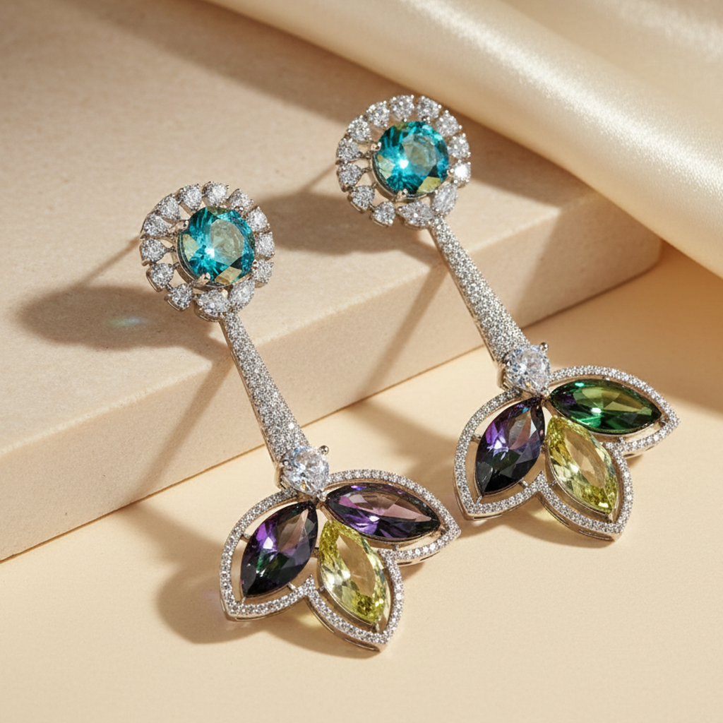 The Iridescent & CZ Floral Dangle Earrings are a perfect mix of statement-making glamour and timeless beauty. Ideal for weddings, evening galas, or festive parties, they ensure you leave a sparkling impression everywhere you go.