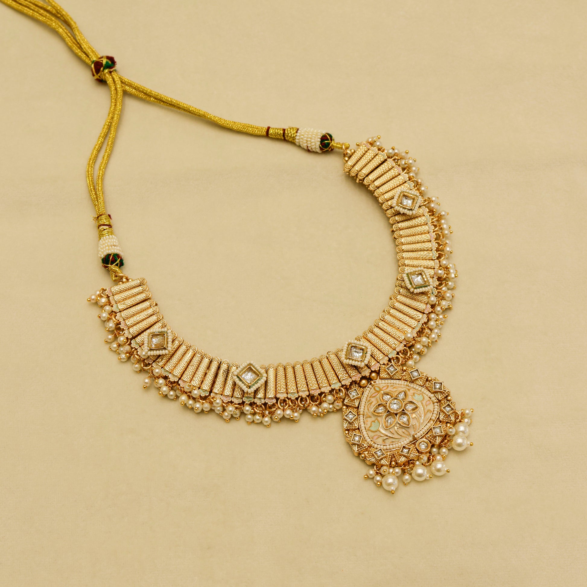 The Aanura Kundan Choker Necklace is a majestic design featuring a wide choker lined with green kundan stones and delicate pearl accents. A grand central pendant, highlighted with intricate detailing and green beads, enhances its royal presence. Paired with matching earrings, this set radiates traditional elegance for grand celebrations.
