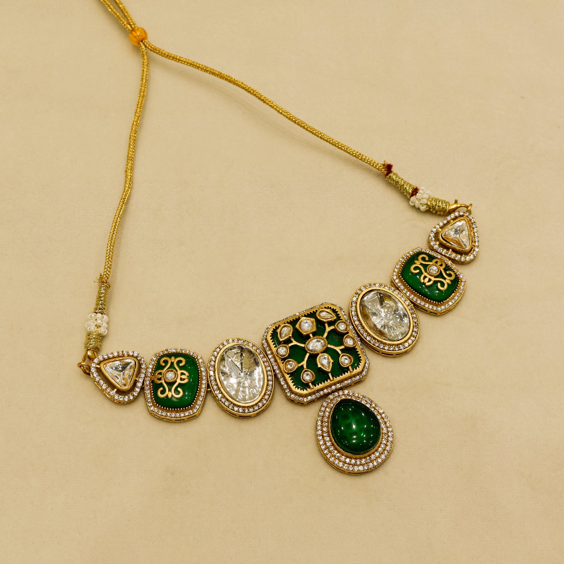 The Aanura Kundan Choker Necklace is designed with a striking teardrop-shaped pendant surrounded by rich red, green, and white kundan stones. The choker base features antique artistry with matching stud earrings for a complete royal set. Its bold centerpiece makes it an excellent choice for brides and festive occasions.