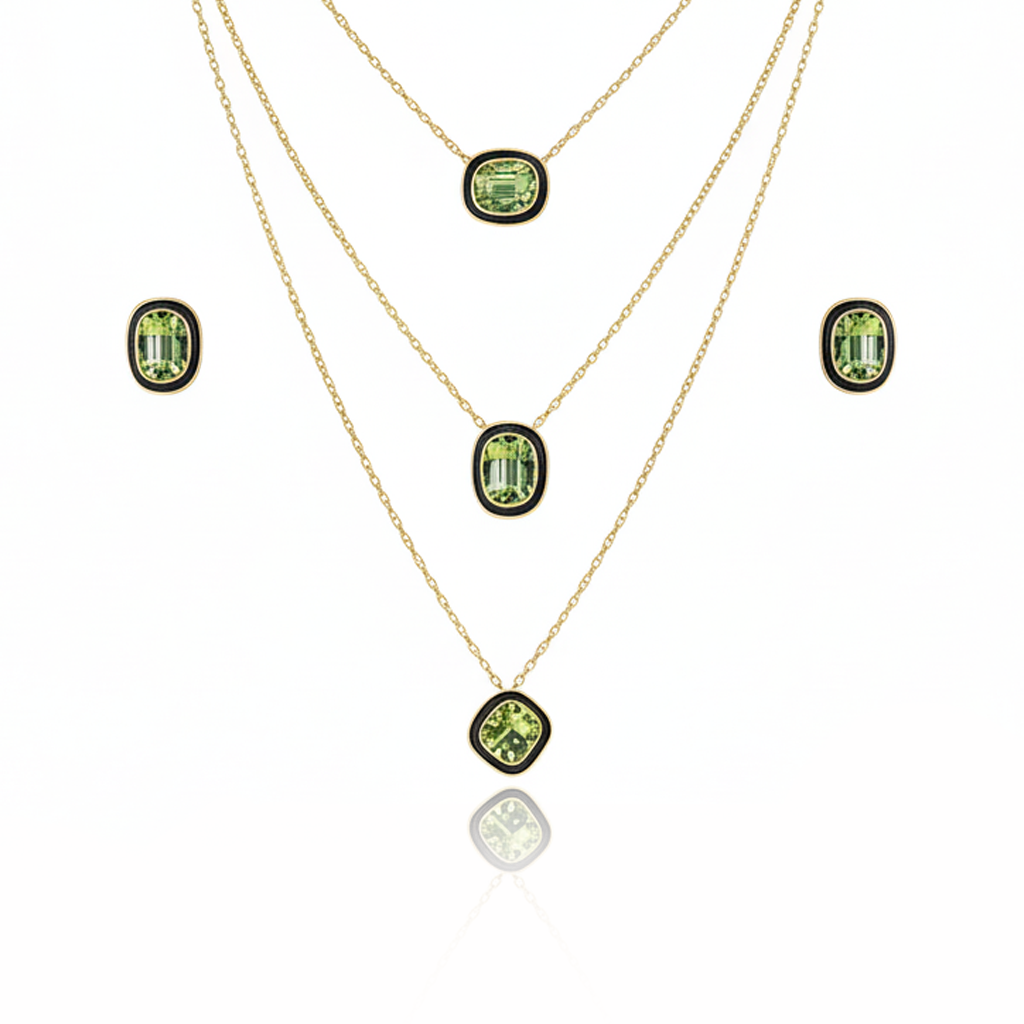 The Layered Red Pendant Necklace Set is a chic jewelry design featuring three layers of fine stainless steel chains, each adorned with bold red faceted stones in oval and cushion cuts. Paired with matching earrings, this set combines modern style with timeless elegance, making it suitable for both festive and everyday wear.