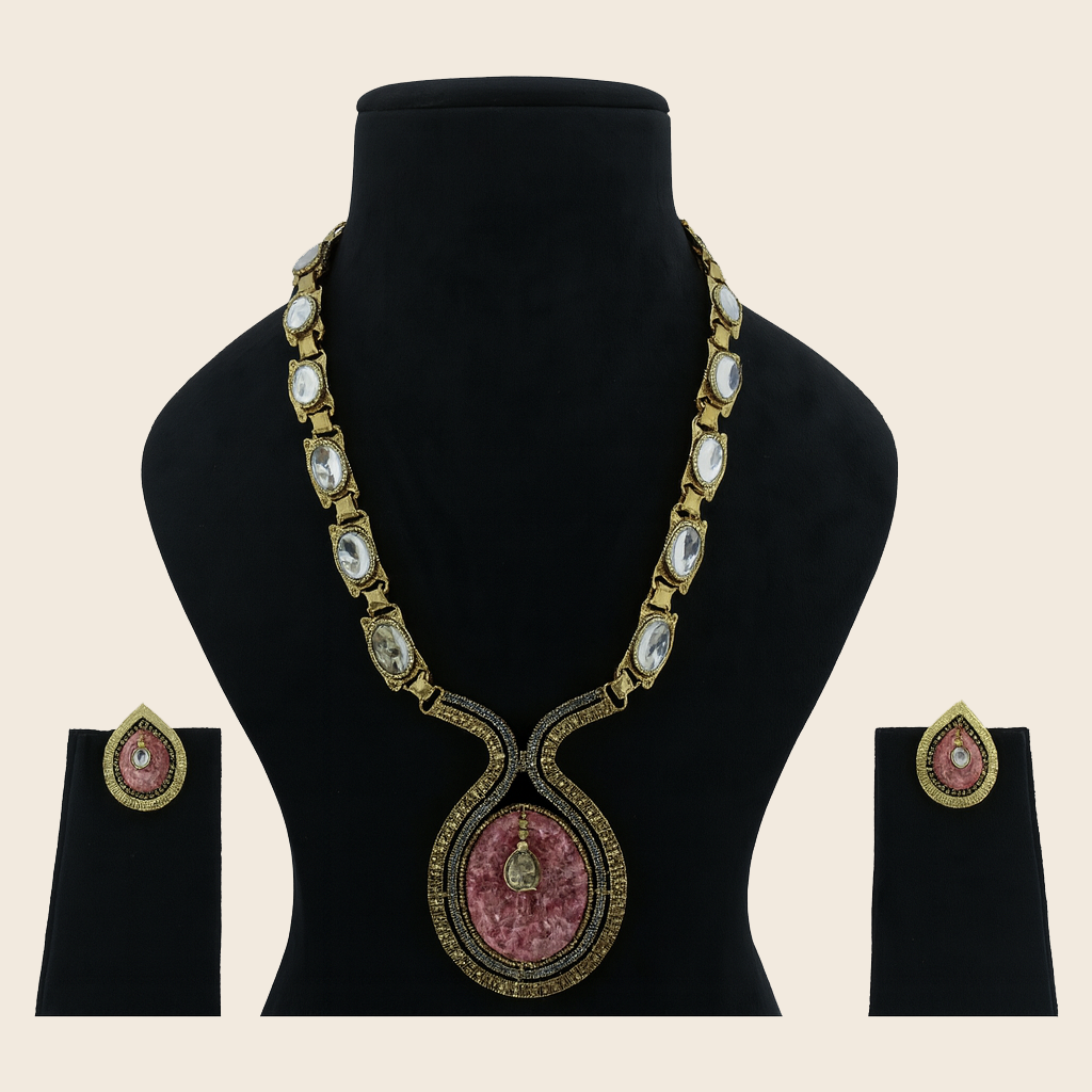 The Aanura Long Kundan Necklace is crafted with a sleek kundan-studded chain and a striking oval pink pendant centerpiece. Enhanced with antique detailing and paired with matching earrings, this design beautifully merges elegance with tradition. A versatile piece that can elevate both bridal and festive outfits.
