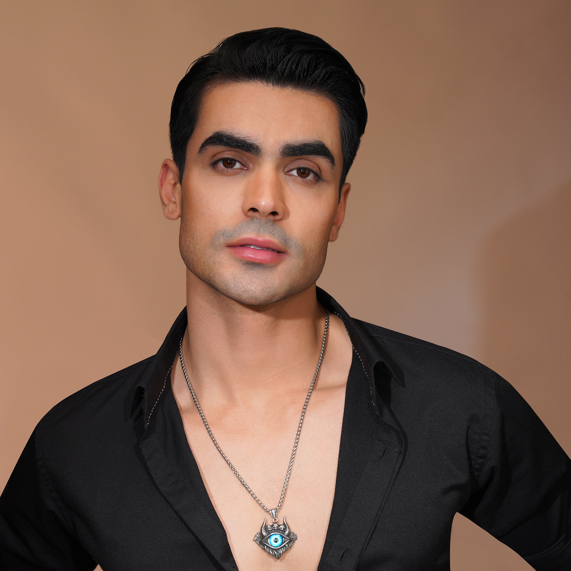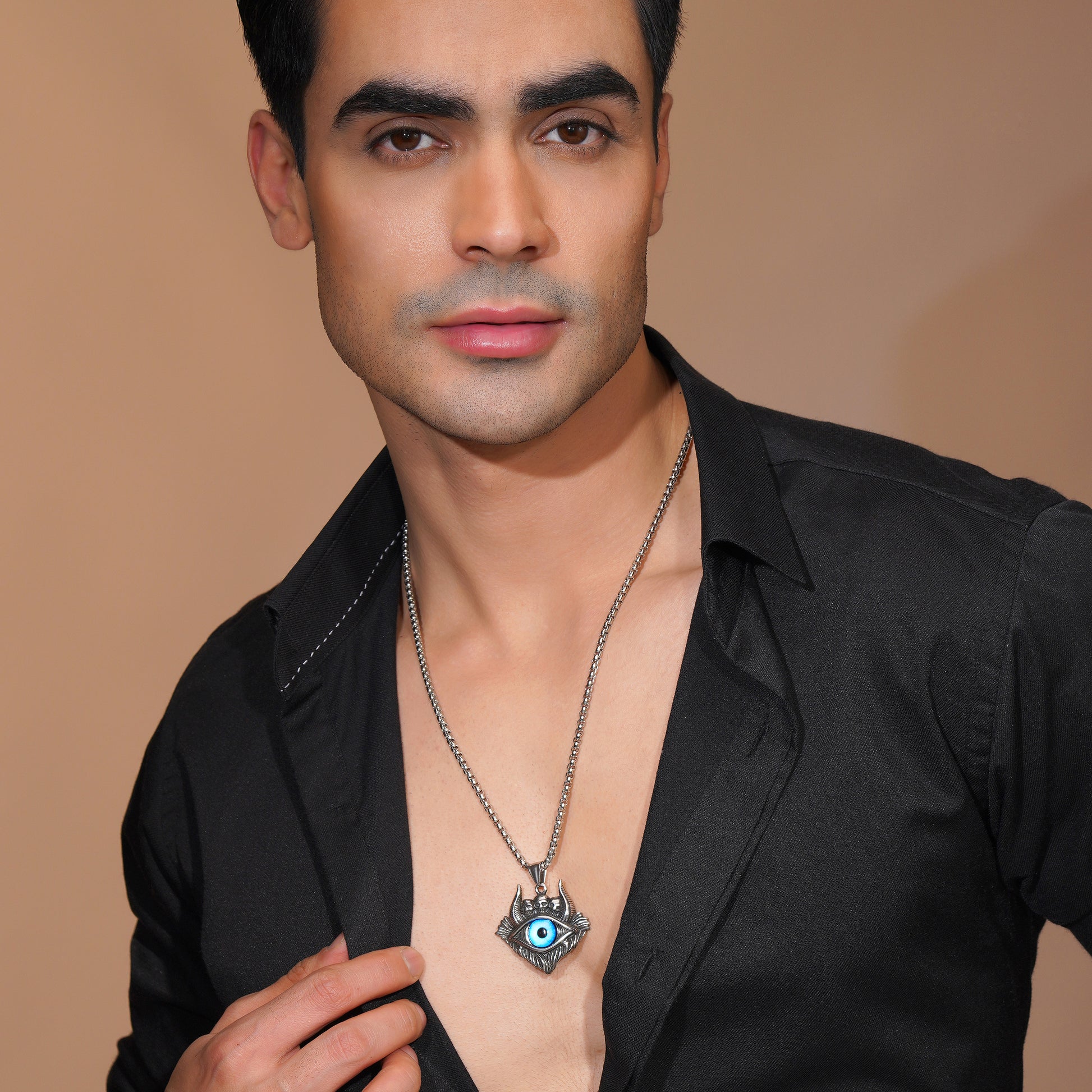 A bold and stylish men's pendant necklace featuring the iconic Evil Eye symbol, designed to offer both protection and fashion. The pendant is crafted with intricate detailing and a sleek design, perfect for adding a modern touch to any outfit.