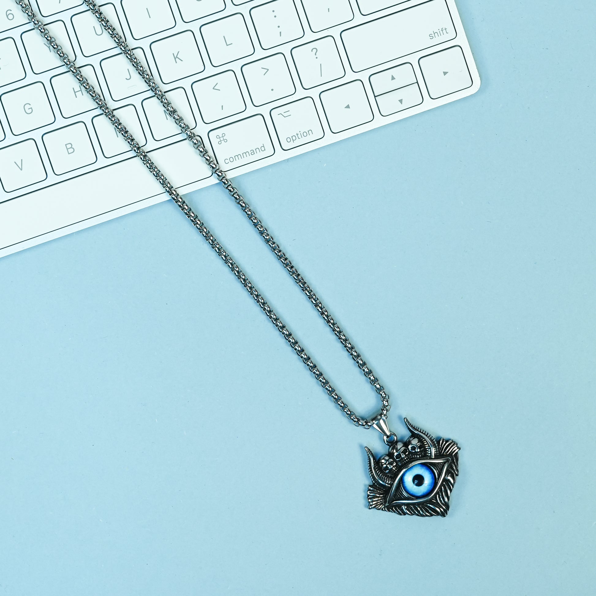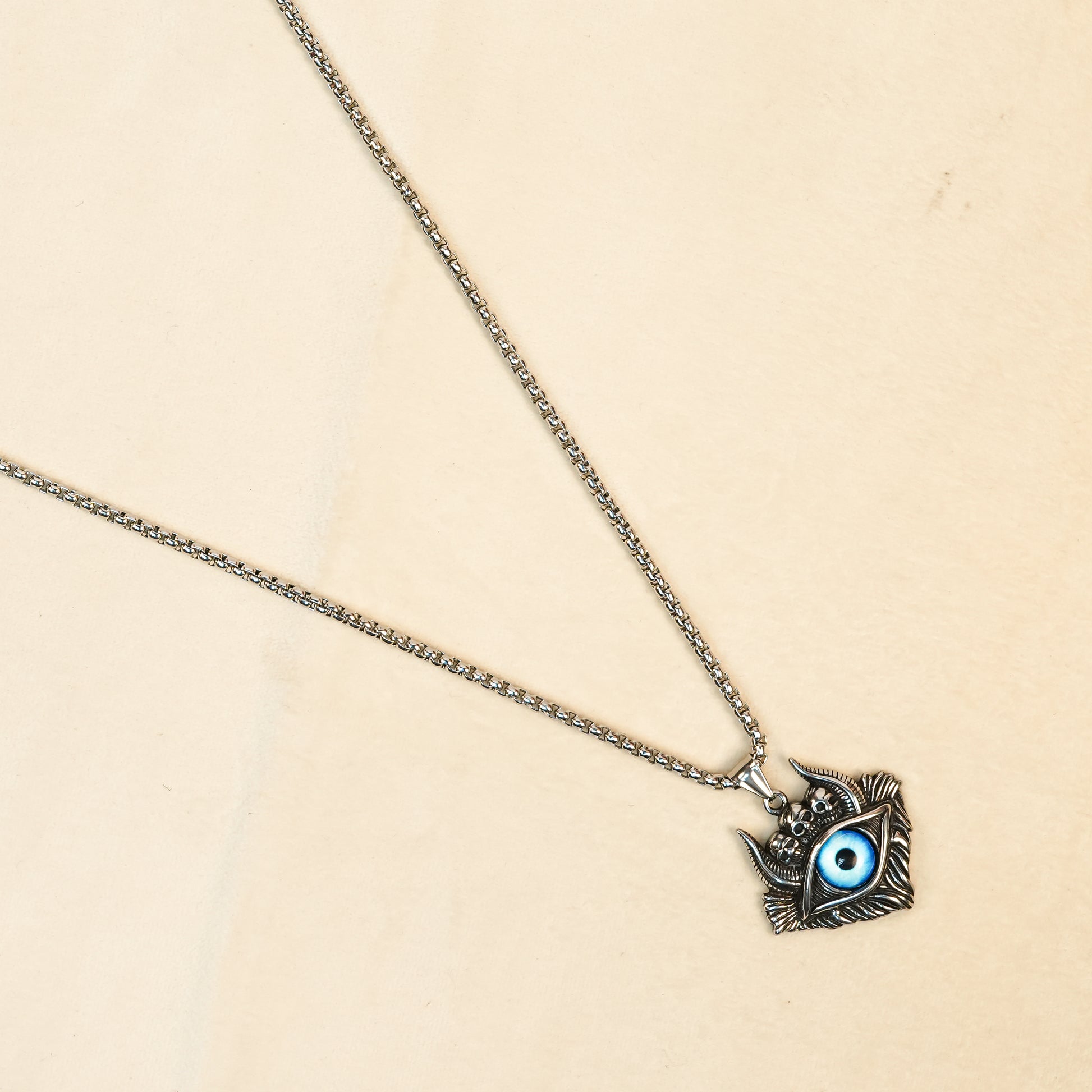 - Design: Evil Eye pendant with an intricately detailed design and a vibrant blue center