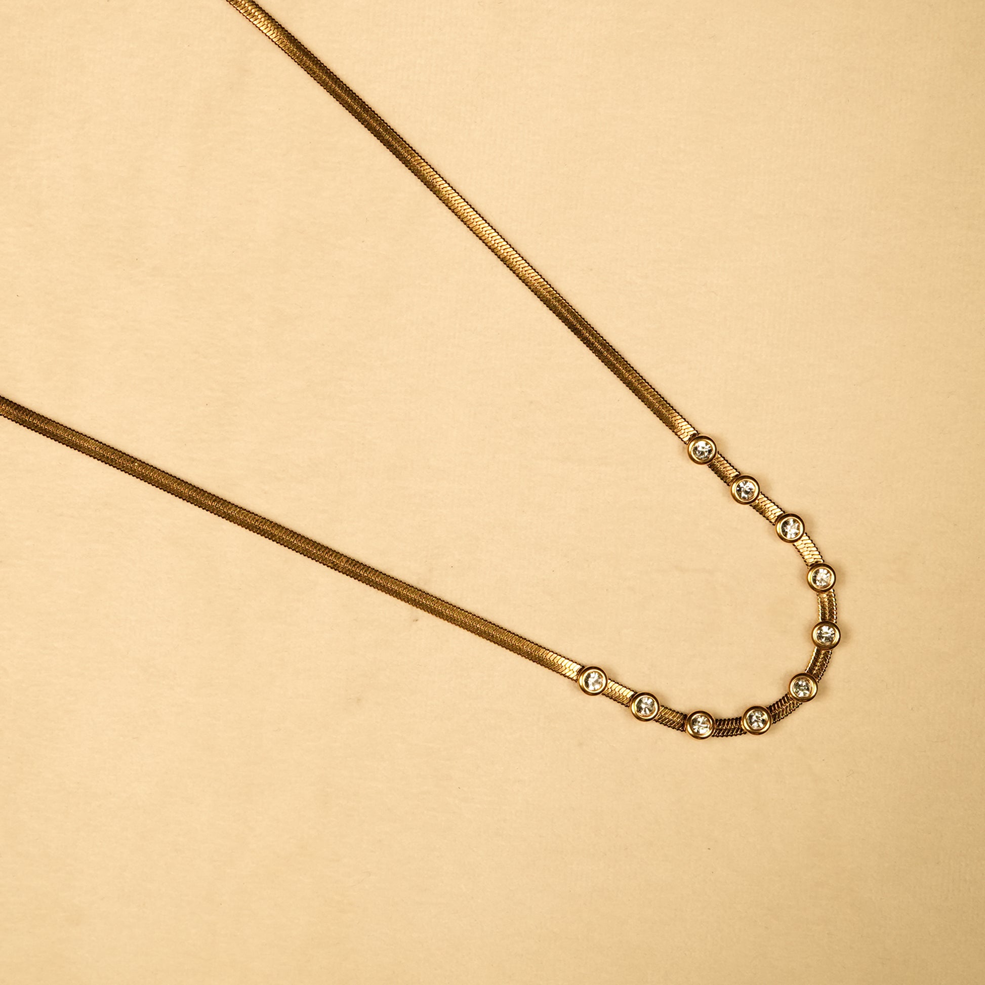 - Design Detail: Curved stone-set accent on a smooth, flexible chain