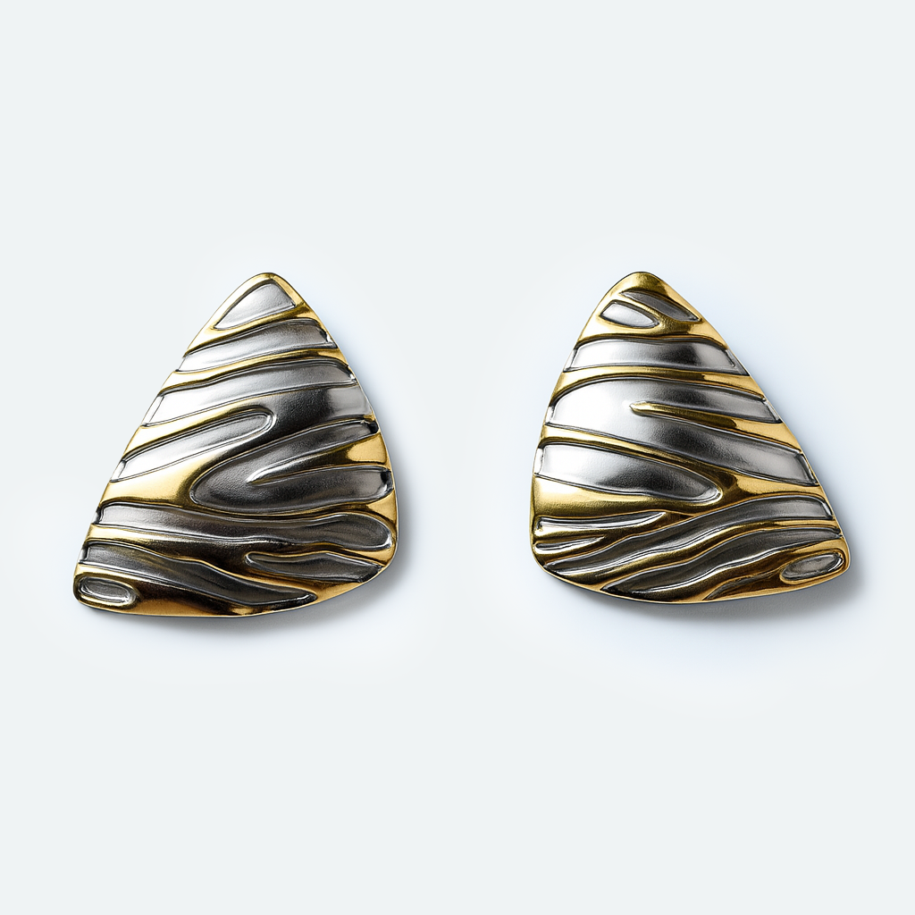 The Aanura Molten Wave Dual-Tone Shield Earrings are a true statement of wearable art. With a shield-like triangular silhouette and flowing molten wave patterns in gold and silver, these earrings are designed to capture light and attention with every move.