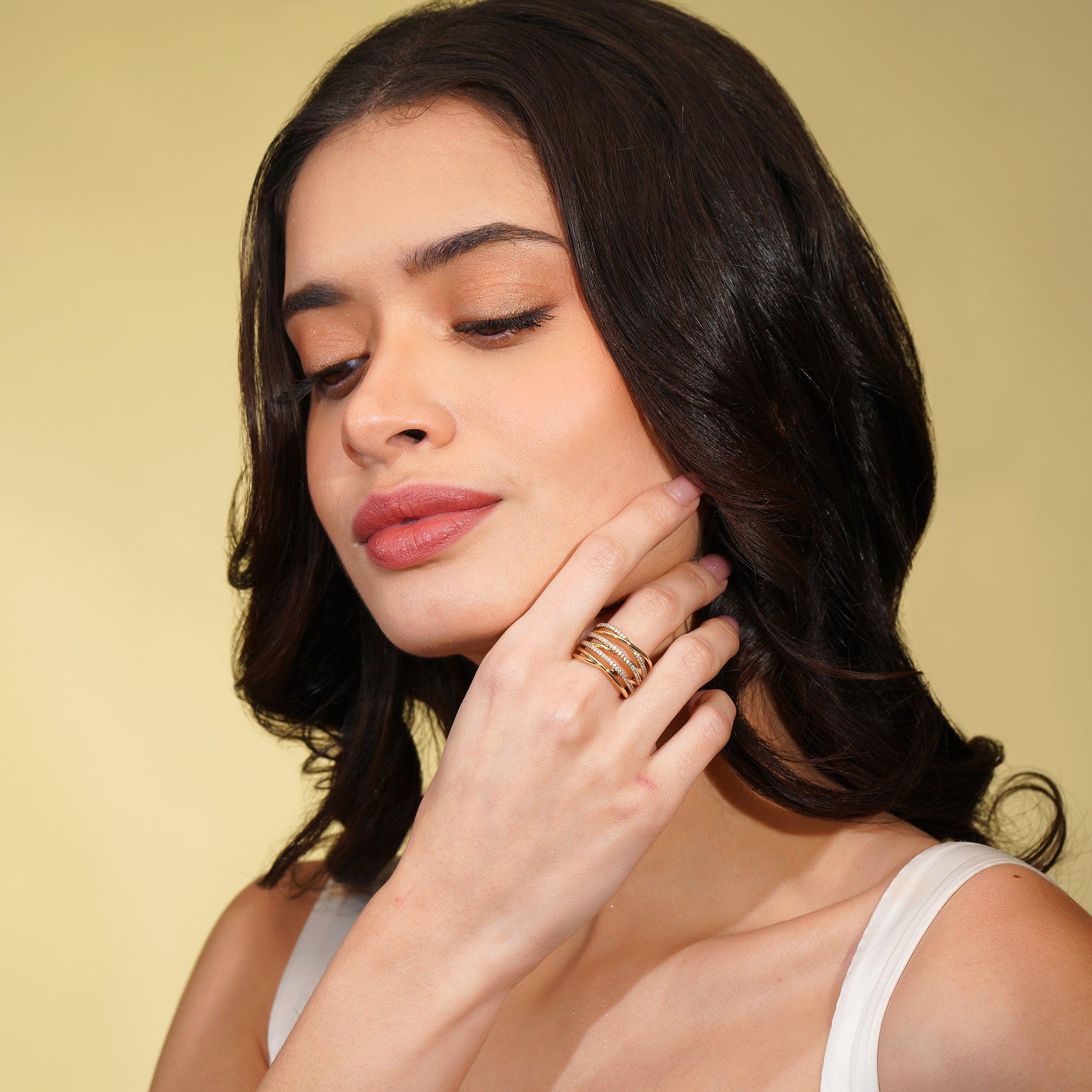 The Aanura multi-band statement ring showcases an elegant layered design with fluid curved bands accented by shimmering crystal detailing. The overlapping structure creates depth and movement, making this ring a refined statement piece for women who love modern luxury with a bold yet graceful appeal.