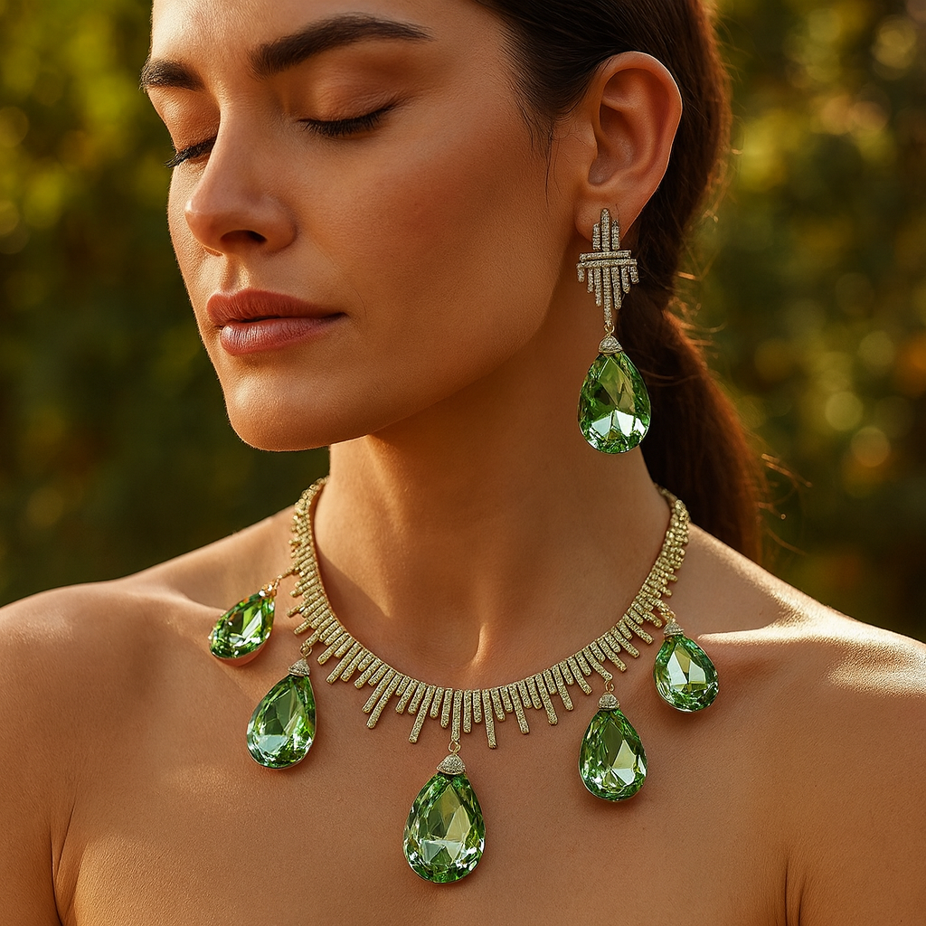 The Orange Teardrop Crystal Necklace Set is a statement jewelry piece featuring vibrant orange teardrop crystals suspended from a geometric fringe-inspired necklace. Crafted in polished stainless steel, this bold necklace is paired with matching earrings, making it the perfect accessory for festive occasions, weddings, and glamorous evenings.