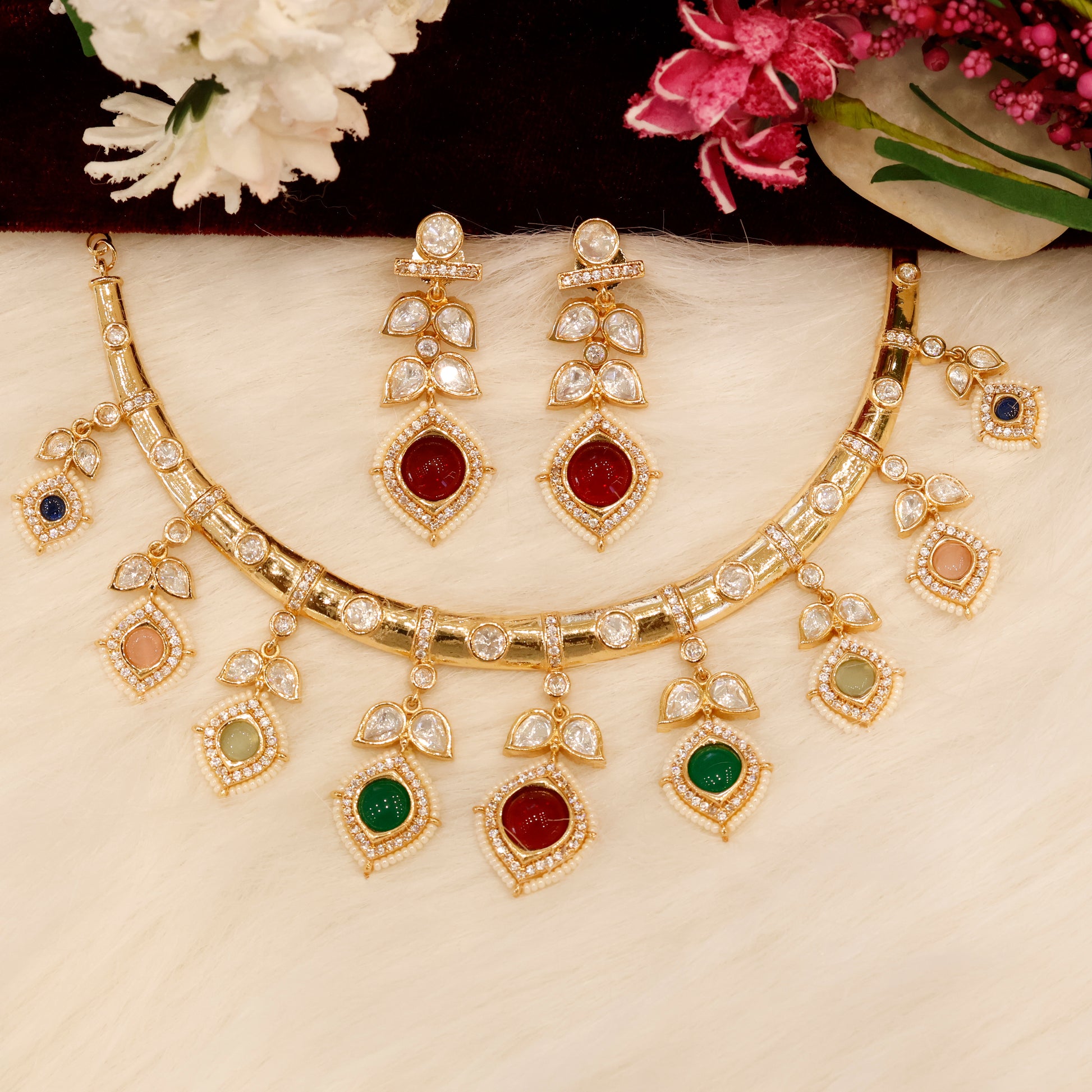 Aanura Peacock Green Kundan Necklace & Earrings Set