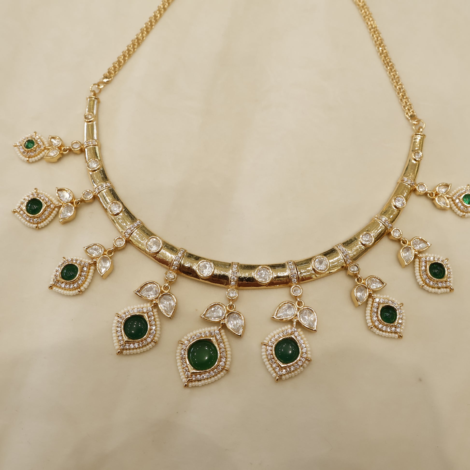 Add elegance to your festive look with the Aanura Jewellery Peacock Green Kundan Necklace & Earrings Set. Featuring teardrop-shaped green stones surrounded by kundan crystals, the design is inspired by peacock feather motifs. The necklace is paired with long matching earrings for a graceful and traditional finish.